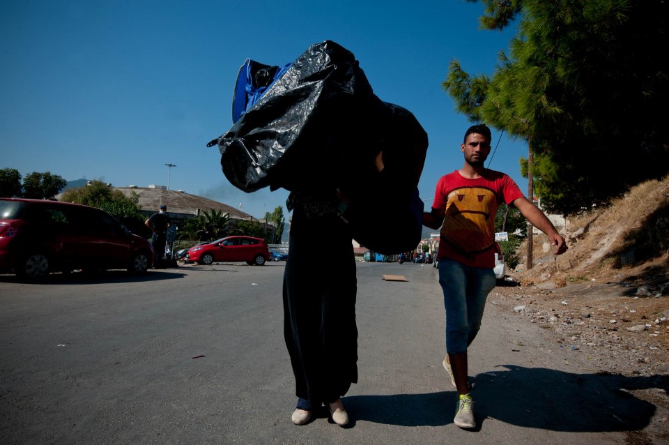 Γυναίκα πρόσφυγας κουβαλάει πλαστική σκηνή στο κεφάλι. Χιλιάδες πρόσφυγες βρίσκονται συγκεντρωμένοι στο λιμάνι της Μυτιλήνης και περιμένουν την αναχώρησή τους προς Πειραιά. Παρασκευή, 4 Σεπτεμβρίου 2015.