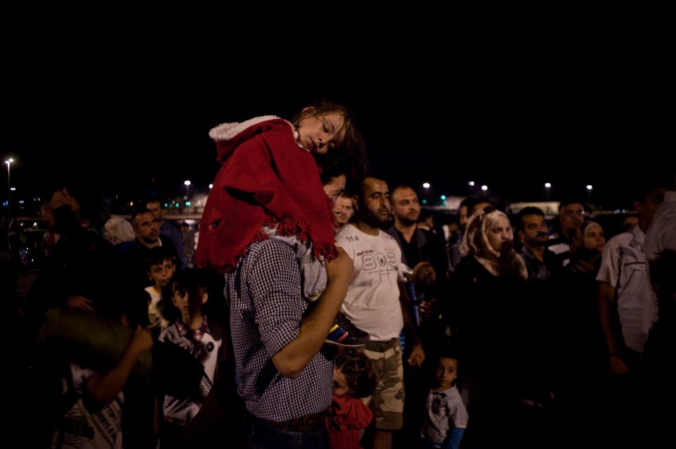 Μικρό κορίτσι κοιμάται στους ώμους του πατέρα του, ενώ αποβιβάζονται από το πλοίο Tera Jet. Περίπου 1500 πρόσφυγες απο την Συρία, έφτασαν από την Λέσβο στο λιμάνι του Πειραιά με το ναυλωμένο από την ελληνική κυβέρνηση πλοίο. Τρίτη, 1 Σεπτεμβρίου 2015.