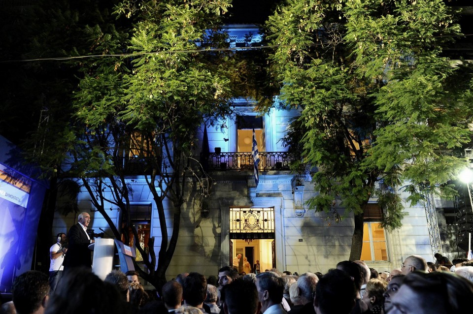 Ο Βαγγέλης Μεϊμαράκης, αρχηγός της Νέας Δημοκρατίας, μιλάει σε προεκλογική συγκέντρωση του κόμματος μπροστά από τα ιστορικά γραφεία της Ρηγίλλης. Αθήνα, Τρίτη 1 Σεπτεμβρίου 2015.