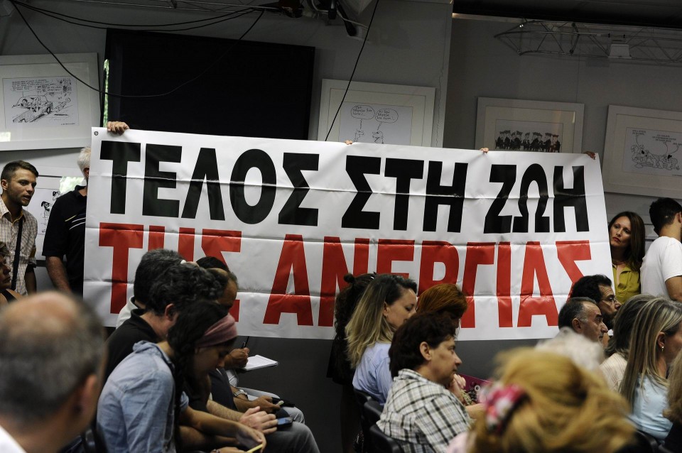 Πανό διαμαρτυρίας αναρτημένο από συμβασιούχους και υπαλλήλους του καναλιού της Βουλής, στη συνέντευξη τύπου της Προέδρου της Βουλής Ζωής Κωνσταντοπούλου στην ΕΣΗΕΑ. Αθήνα, 31 Αυγούστου 2015.