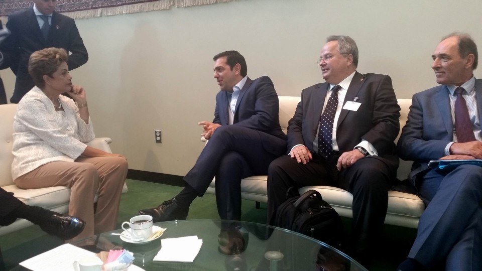 Συνάντηση του Πρωθυπουργού Αλέξη Τσίπρα με την Πρόεδρο της Βραζιλίας Ντίλμα Ρούσεφ, πριν από την έναρξη των εργασιών της Γενικής Συνέλευσης των Ηνωμένων Εθνών. Συνοδεύεται από τον υπουργό Εξωτερικών Νίκο Κοτζιά και τον υπουργό Οικονομίας Γιώργο Σταθάκη. Νέα Υόρκη, Δευτέρα 28 Σεπτεμβρίου 2015.