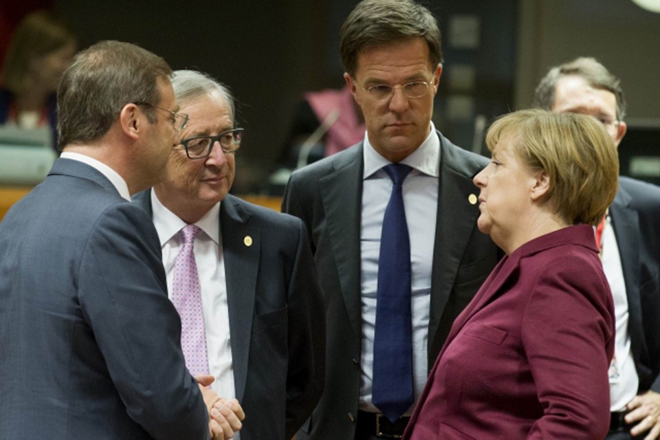 O πρωθυπουργός της Πορτογαλίας Πέδρο Πάσους Κοέλιο, ο πρόεδρος της Ευρωπαϊκής Επιτροπής Ζαν-Κλοντ Γιουνκέρ, ο πρωθυπουργός της Ολλανδίας Μαρκ Ρούτε και η καγκελάριος της Γερμανίας Άνγκελα Μέρκελ συζητούν, κατά την διάρκεια της Συνόδου Κορυφής της ΕΕ για το προσφυγικό. Βρυξέλλες, Πέμπτη 15 Οκτωβρίου 2015.