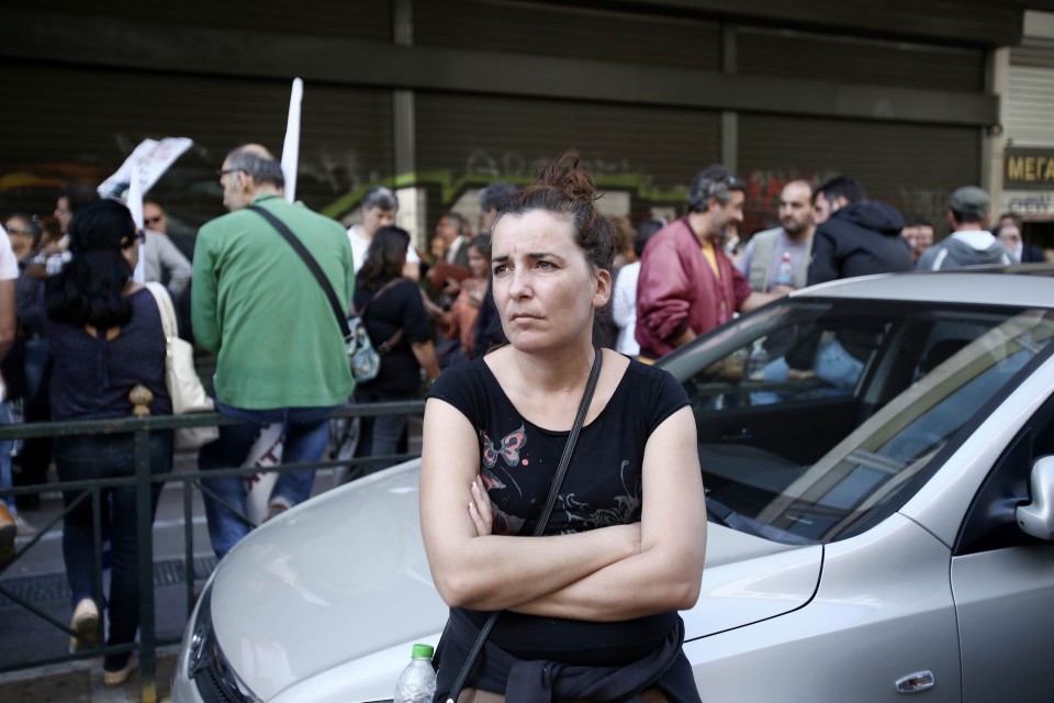 Γυναίκα αστυνομικός της ασφάλειας της Βουλής προσπαθεί να εμποδίσει άλλη γυναίκα, που από τα θεωρεία απευθύνεται στον πρωθυπουργό κρατώντας μλπούζα με το σύνθημα ¨Ταπεινώσατε την Δημοκρατία" . Συζήτηση και ψήφιση στην ολομέλεια της Βουλής, του πολυνομοσχεδίου του υπουργείου Οικονομικών με τα προαπαιτούμενα μέτρα. Αθήνα, Παρασκευή 16 Οκτωβρίου 2015.
