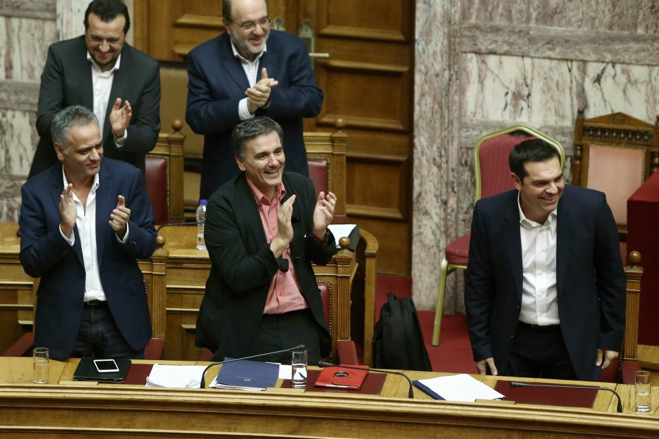 Ο πρωθυπουργός Αλέξης Τσίπρας, ο υπουργός Οικονομικών Ευκλείδης Τσακαλώτος και οι υπόλοιποι υπουργοί της κυβέρνησης χειροκροτούν και γελούν. Συζήτηση και ψήφιση στην Ολομέλεια της Βουλής, του πολυνομοσχεδίου του υπουργείου Οικονομικών με τα προαπαιτούμενα μέτρα. Αθήνα, Παρασκευή 16 Οκτωβρίου 2015.