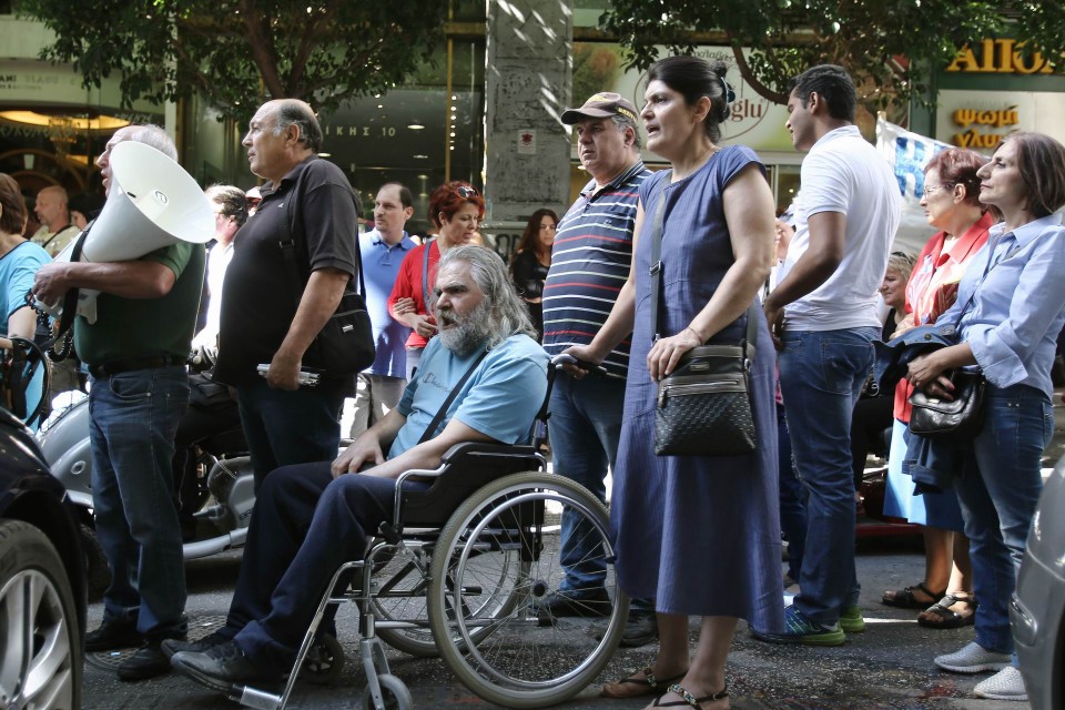 Συγκέντρωση διαμαρτυρίας ΑΜΕΑ στο υπουργείο Οικονομικών, από την Συντονιστική Επιτροπή Αγώνα Αναπήρων (ΣΕΑΑΝ). Αθήνα, Τρίτη 13 Οκτωβρίου 2015.