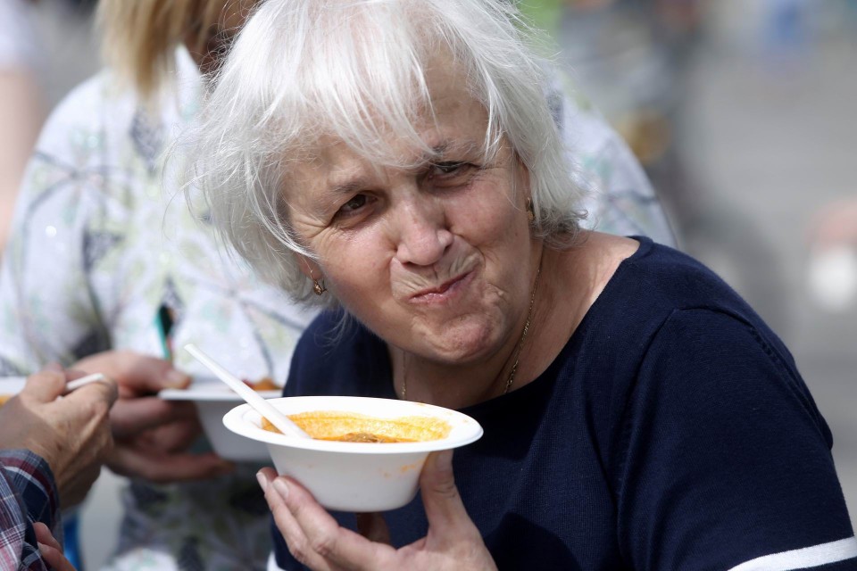 Γυναίκα δοκιμάζει σούπα από λαχανικά. Δωρεάν γεύμα για 5.000 άτομα από τη οργάνωση Feedback, μια διεθνή πρωτοβουλία κατά της σπατάλης τροφίμων. Ένα γιγαντιαίο μπριάμ, σούπα με ανάμεικτα λαχανικά, μαγειρεύθηκε από γνωστούς Αθηναίους μάγειρες στην πλατεία Κοτζιά. Αθήνα, Κυριακή 11 Οκτωβρίου 2015.