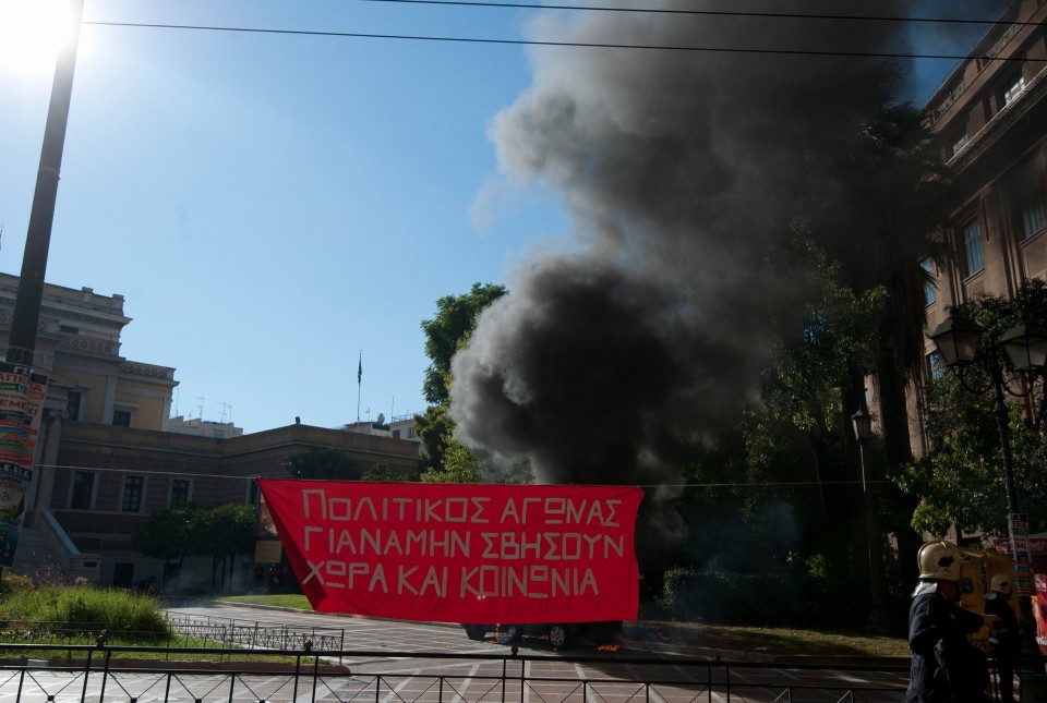Μικρό φορτηγάκι δημοσίας χρήσης καίγεται στην οδό Σταδίου, πίσω από πανό με μήνυμα αγώνα. Εκτεταμένα επεισόδια σημειώθηκαν στο κέντρο της Αθήνας, από ομάδες κουκουλοφόρων. Τα επεισόδια σημειώθηκαν μετά το τέλοςτης πορείας διαμαρτυρίας ενάντια στα μέτρα λιτότητας και σε αλλαγές στο ασφαλιστικό, στο πλαίσιο της 24ωρης γενικής, πανελλαδικής απεργίας από ΓΣΕΕ και ΑΔΕΔΥ. Αθήνα, Πέμπτη 12 Νοεμβρίου 2015.