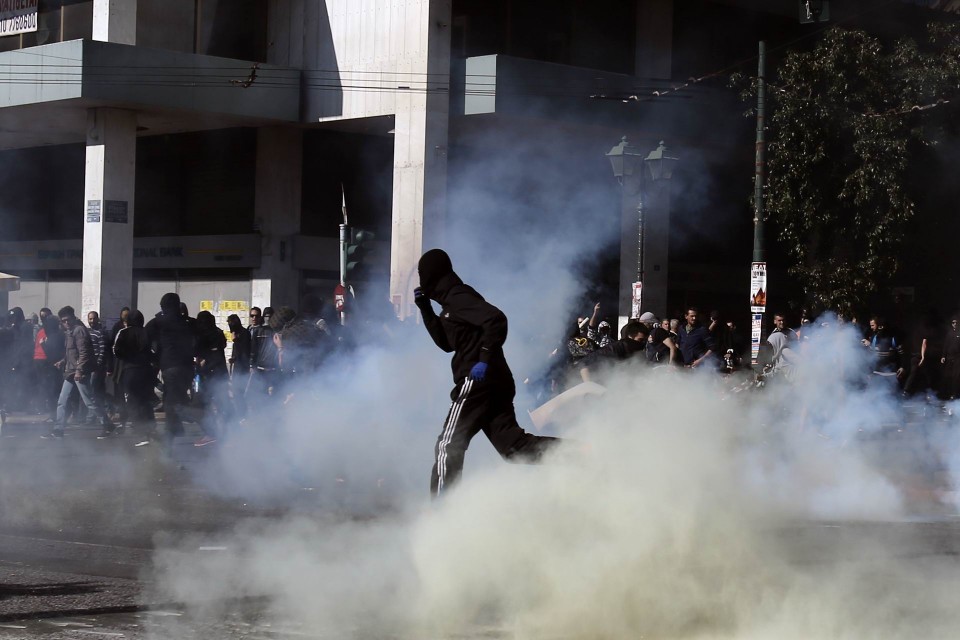 Άντρας με κουκούλα ανάμεσα σε καπνούς από μολότωφ και δακρυγόνα στο Σύνταγμα. Εκτεταμένα επεισόδια σημειώθηκαν στο κέντρο της Αθήνας, από ομάδες κουκουλοφόρων . Τα επεισόδια σημειώθηκαν μετά το τέλοςτης πορείας διαμαρτυρίας ενάντια στα μέτρα λιτότητας και σε αλλαγές στο ασφαλιστικό, στο πλαίσιο της 24ωρης γενικής, πανελλαδικής απεργίας από ΓΣΕΕ και ΑΔΕΔΥ. Αθήνα, Πέμπτη 12 Νοεμβρίου 2015.