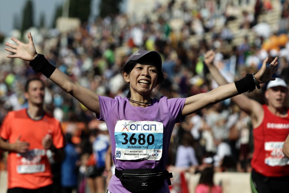 Γιαπωνέζα δρομέας τερματίζει πανευτυχής στον 33ο Μαραθώνιο της Αθήνας. Στον αγώνα της κλασσικής διαδρομής των 42.195 μ. συμμετείχαν συνολικά 16.000 αθλητές, οι ξένοι δρομείς ηταν 6.500 και προέρχονται απο περισσότερες απο 100 χώρες του κόσμου. Αθήνα, Κυριακή 8 Νοεμβρίου 2015.