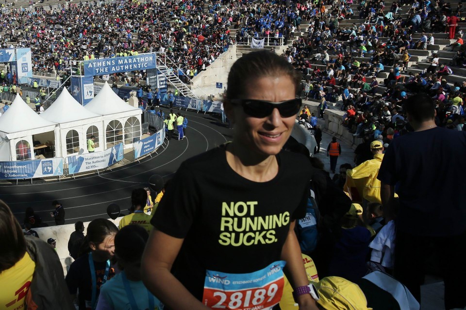 Not running sucks. Γυναίκα δρομέας φοράει μπλούζα που γράφει ότι το να μην τρέχεις είναι χάλια. Στον 33ο Μαραθώνιο της Αθήνας. Στον αγώνα της κλασσικής διαδρομής των 42.195 μ. συμμετείχαν συνολικά 16.000 αθλητές, οι ξένοι δρομείς ηταν 6.500 και προέρχονται απο περισσότερες απο 100 χώρες του κόσμου. Αθήνα, Κυριακή 8 Νοεμβρίου 2015.