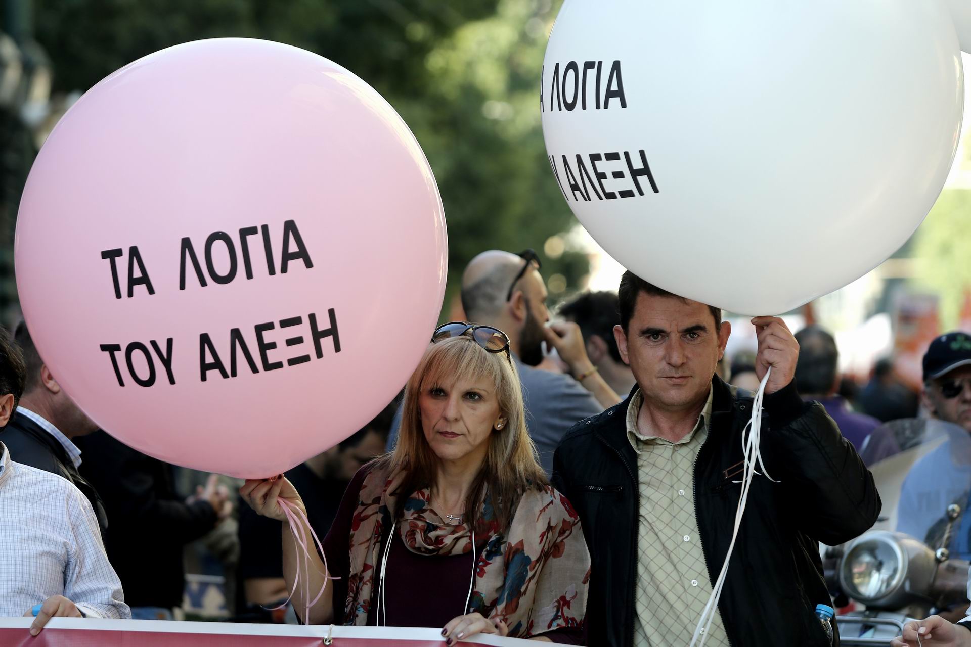 Λόγια και μπαλόνια. Συγκεντρώσεις και πορείες διαμαρτυρίας ενάντια στα μέτρα λιτότητας και σε αλλαγές στο ασφαλιστικό. Στο πλαίσιο της 24ωρης γενικής, πανελλαδικής απεργίας που κήρυξαν ΓΣΕΕ και ΑΔΕΔΥ. Αθήνα, Πέμπτη 12 Νοεμβρίου 2015.