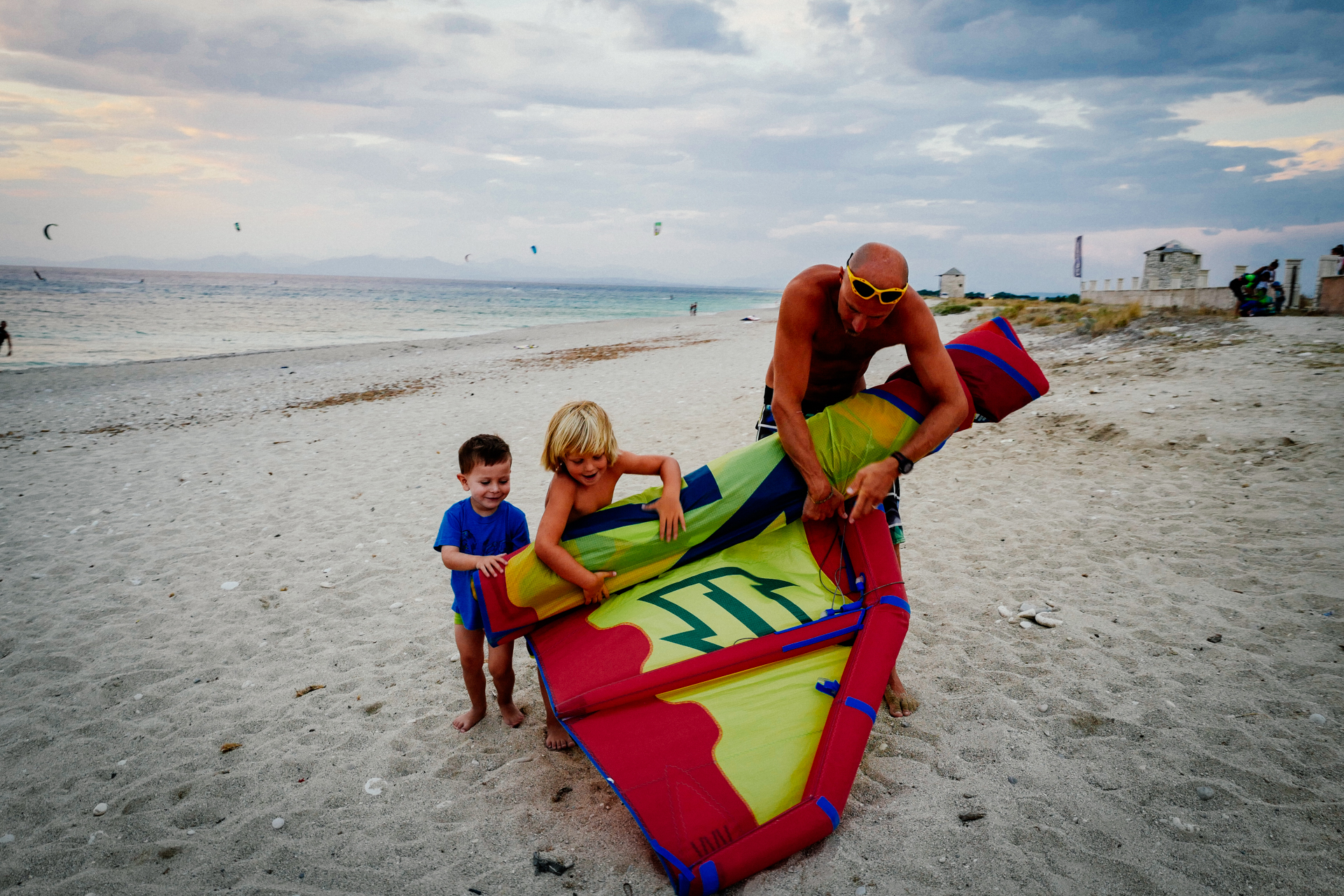 Δυο παιδιά βοηθούν τον μπαμπά τους να μαζέψει το kite του. Αϊ Γιάννης, Λευκάδα, Αύγουστος 2015. φωτο: Γιώργος Τατάκης