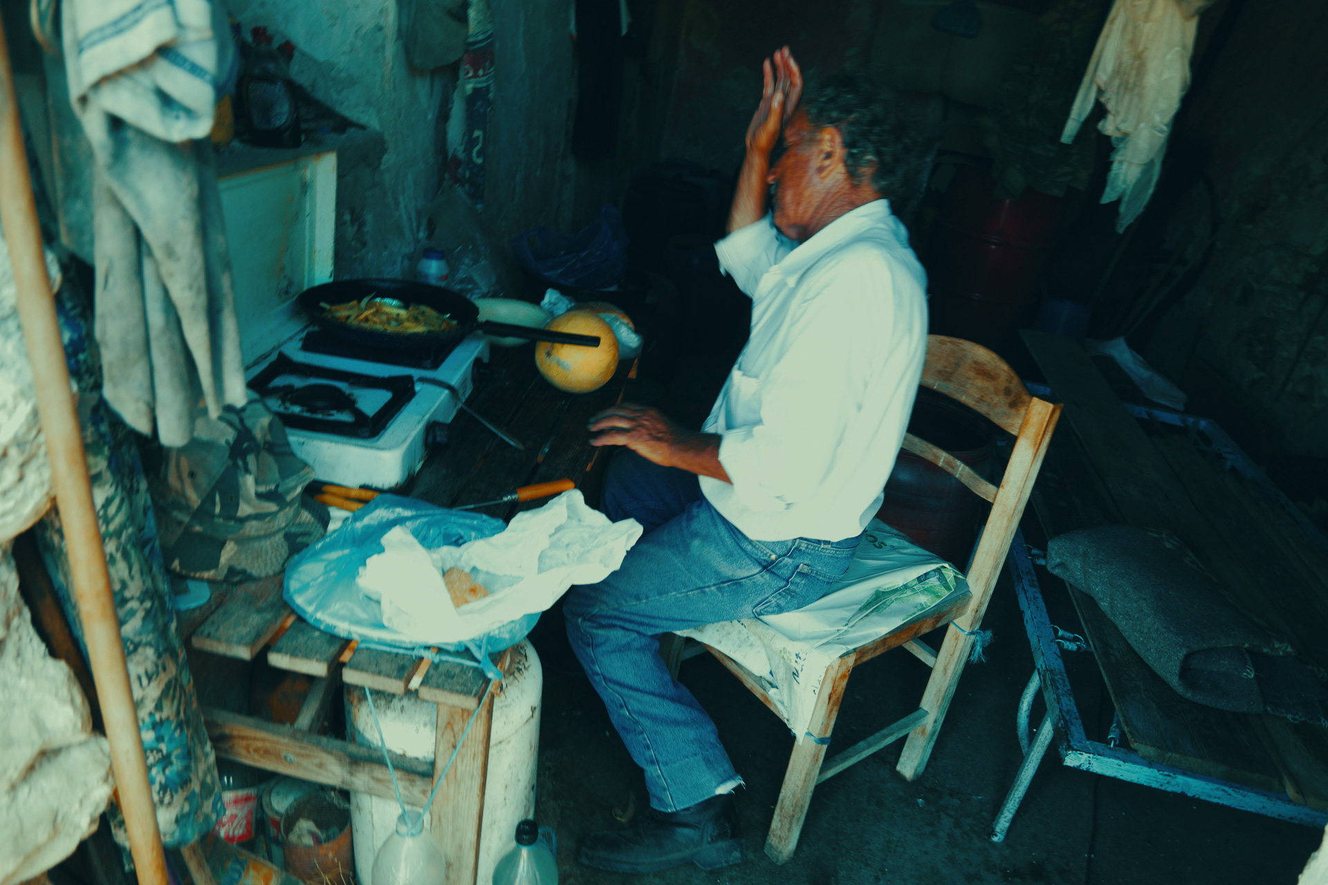 Λέει: «Έρχομαι καμιά φορά εδώ πάνω, απ’ το χωριό στα πεδινά, γιατί έχει δροσιά και ησυχία. Τώρα φτιάχνω κάτι μικρό να φάω, μεσημέριασε. Λίγες πατάτες, λίγο ψωμί, έχω κι ένα πεπόνι για μετά». Δεν λέει το όνομά του, ούτε αν είναι δικές του οι κατσίκες που βόσκουν τριγύρω.