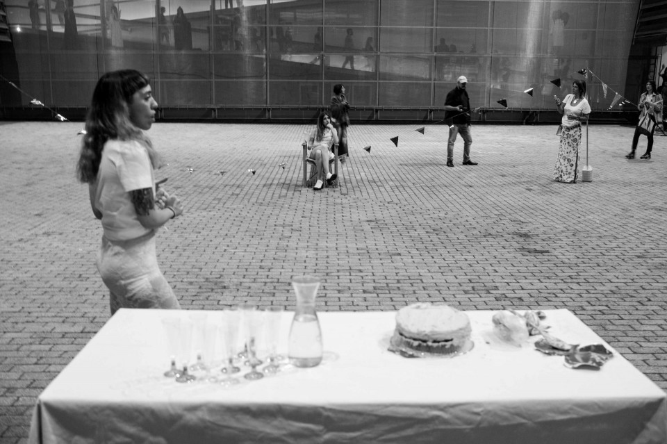 Περφόρμερ βρίσκονται διάσπαρτοι στους εκθεσιακούς χώρους αλληλοεπιδρώντας με τους επισκέπτες. Εγκαίνια του Athens Photo Festival 2016 στο Μουσείο Μπενάκη, κτίριο Πειραιώς.