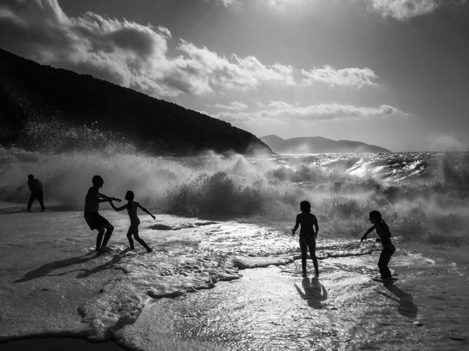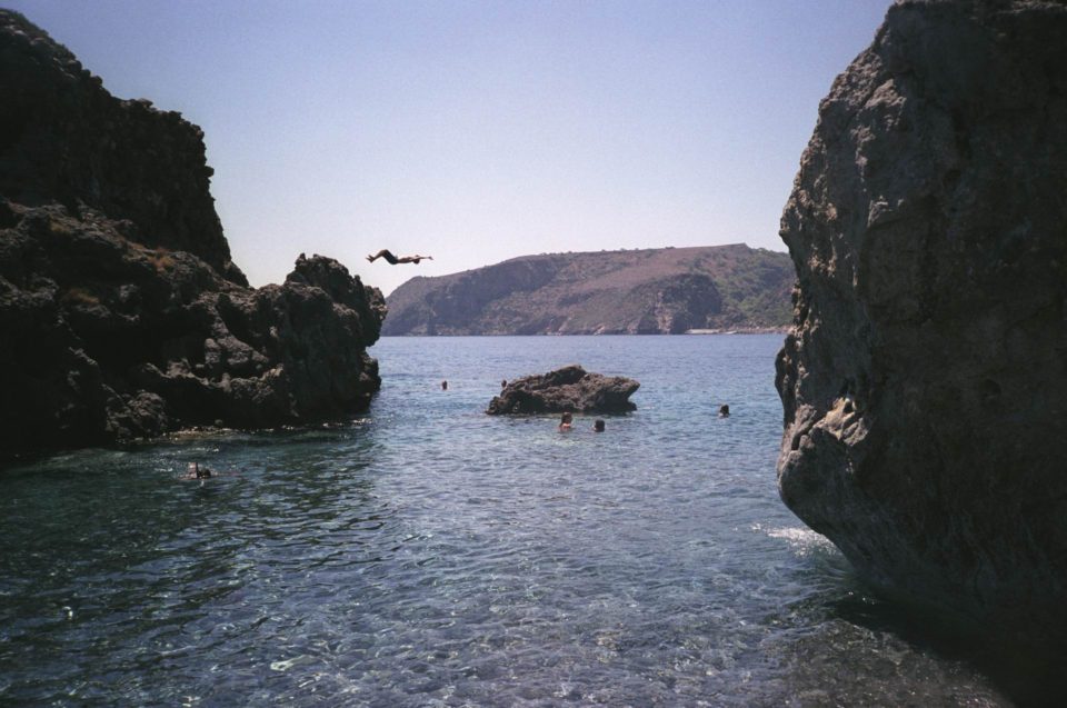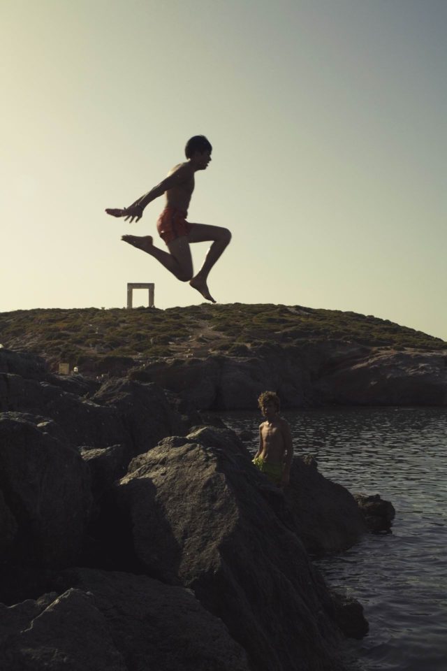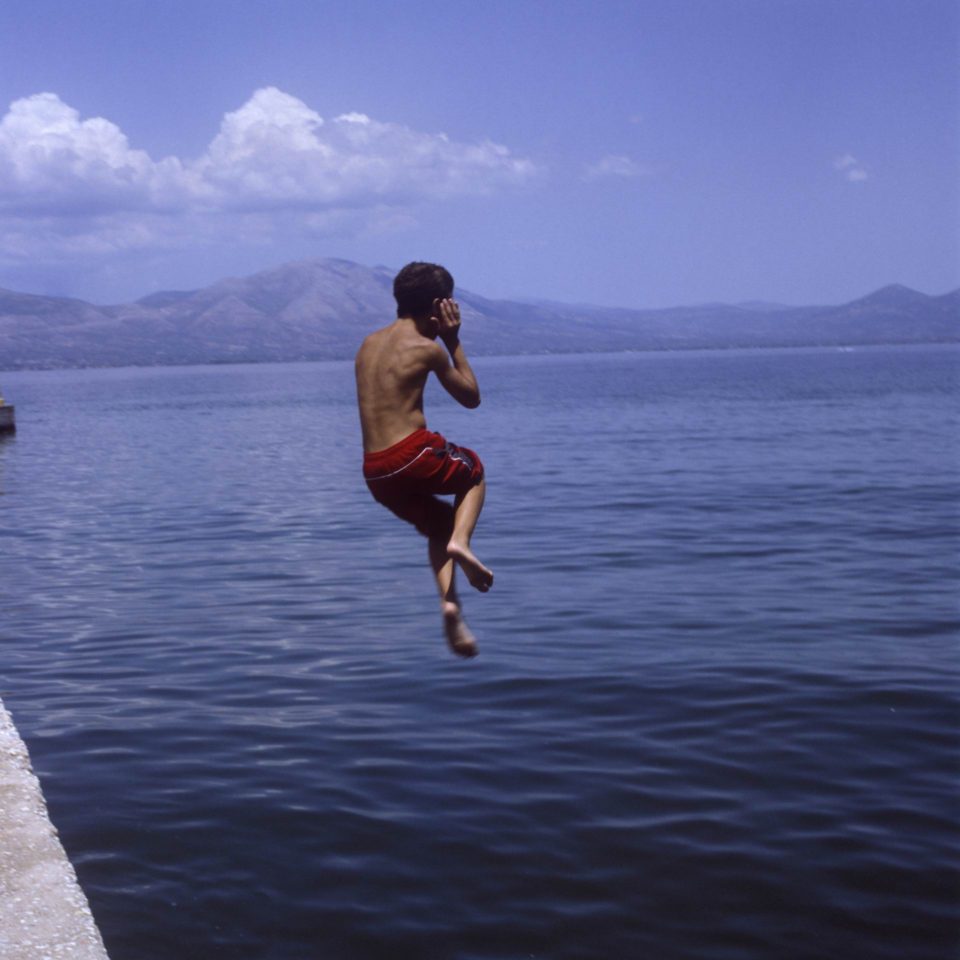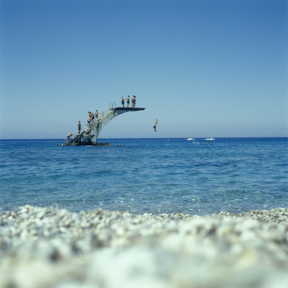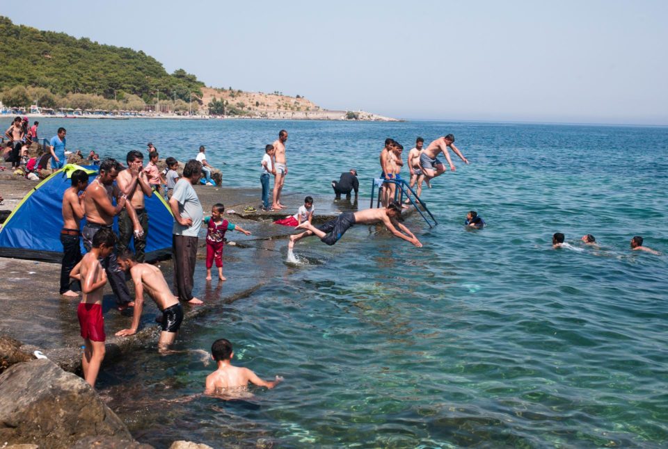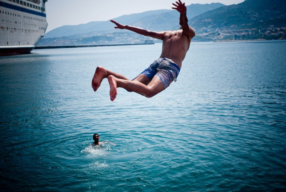 Άντρας βουτάει στη θάλασσα. Δεκάδες χιλιάδες πρόσφυγες από την Συρία και από άλλες χώρες της Ασίας περιμένουν, υπό άθλιες συνθήκες, στο λιμάνι της Μυτιλήνης για να επιβιβαστούν στο πλοίο που θα τους οδηγήσει στον Πειραιά. Εν τω μεταξύ δροσίζονται. Λέσβος, Σεπτέμβριος 2015. ΦΩΤΟ: Άγγελος Χριστοφιλόπουλος/FOSPHOTOS