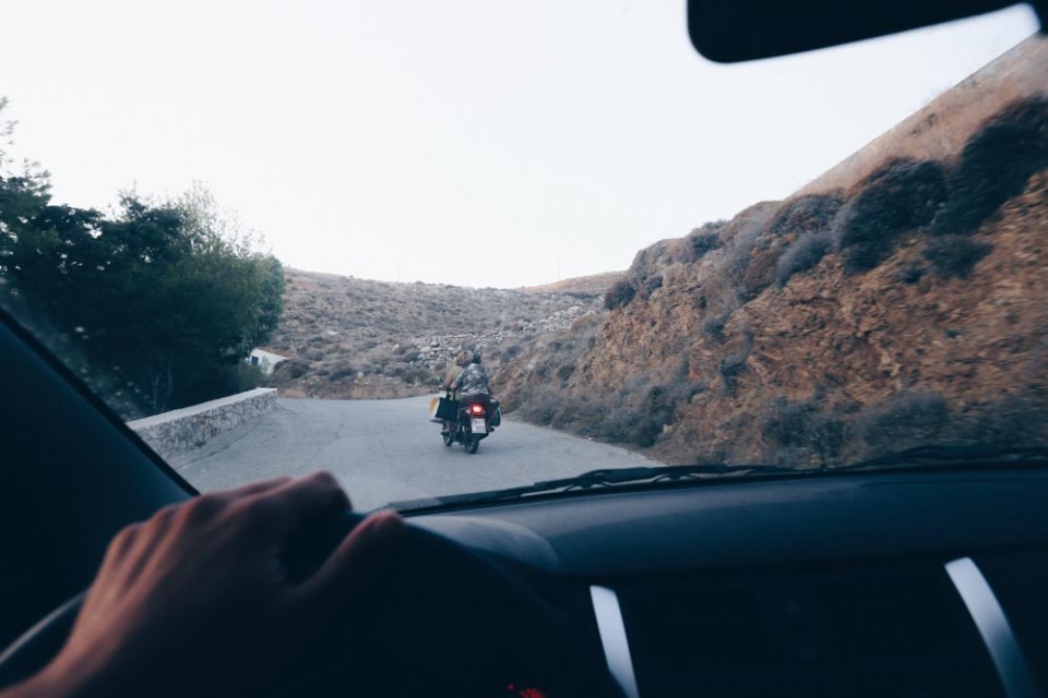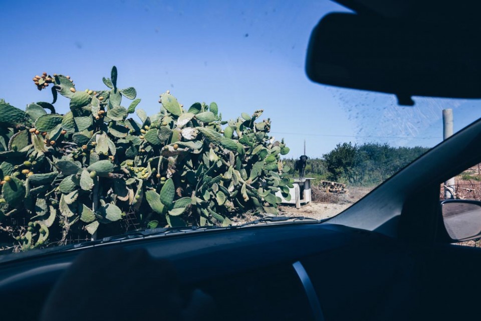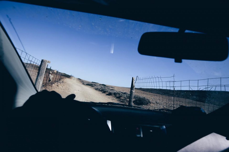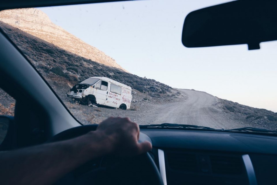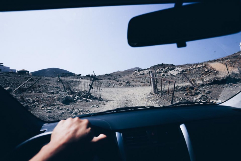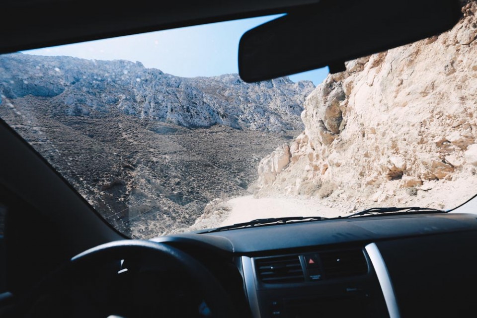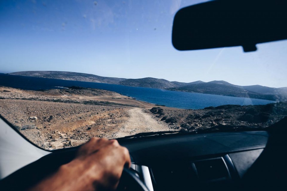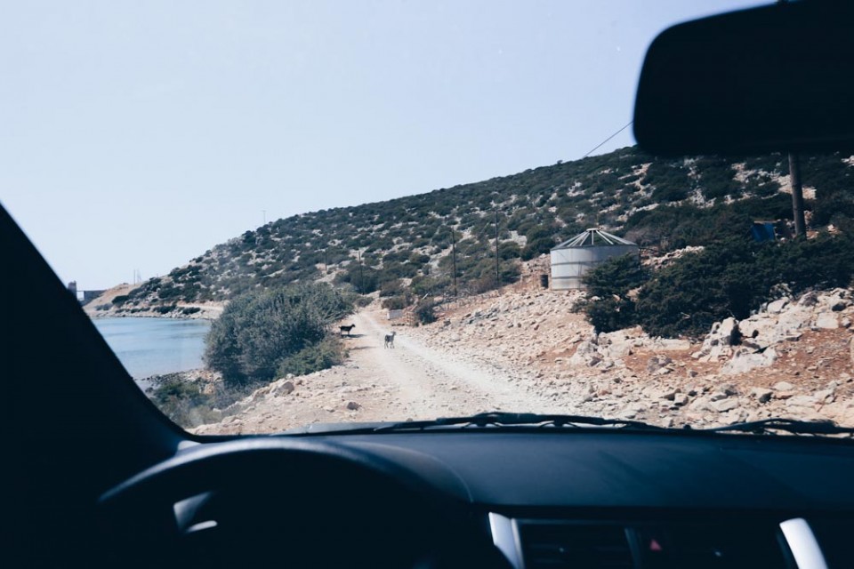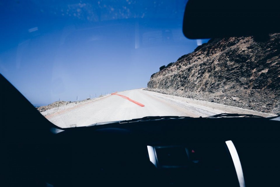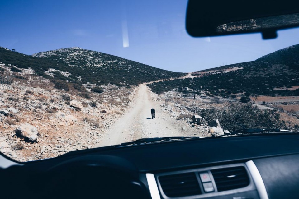 Το οδοιπορικό ονομάζεται «Μέσα απ΄το παρμπρίζ μου» και έχει ως θέμα την άγρια κ ξηρή πλευρά της Αστυπάλαιας. Αυτό που αποτελεί το μεγαλύτερο μέρος του νησιού και που πολλοί δεν περιμένουν να δουν. Αν και οι αποστάσεις δεν είναι μεγάλες, μ’ένα αμάξι που δε μπορεί να κινηθεί με πάνω από 30χμ την ώρα στους χωματόδρομους, το νησί μοιάζει με μια αχανή βραχώδη έρημο, όπου τη μονοτονία διακόπτουν τα διάφορα κατσίκια που εμφανίζονται αναπάντεχα στη διαδρομή. Άλλοτε αστεία κ άλλοτε τραγεγλαφικά, όπως τα «διόδια» από συρματόπλευγμα (όχι, δεν πληρώνεις), το σκύλο που εμφανίζεται απ΄το πουθενά εκλιπαρώντας για νερό ή το παρατημένο φορτηγάκι παράμερα στο δρόμο με το σύνθημα «Μαρία Χουακίνα, είσαι πουτάνα» υπογραφή Σιρίλο.