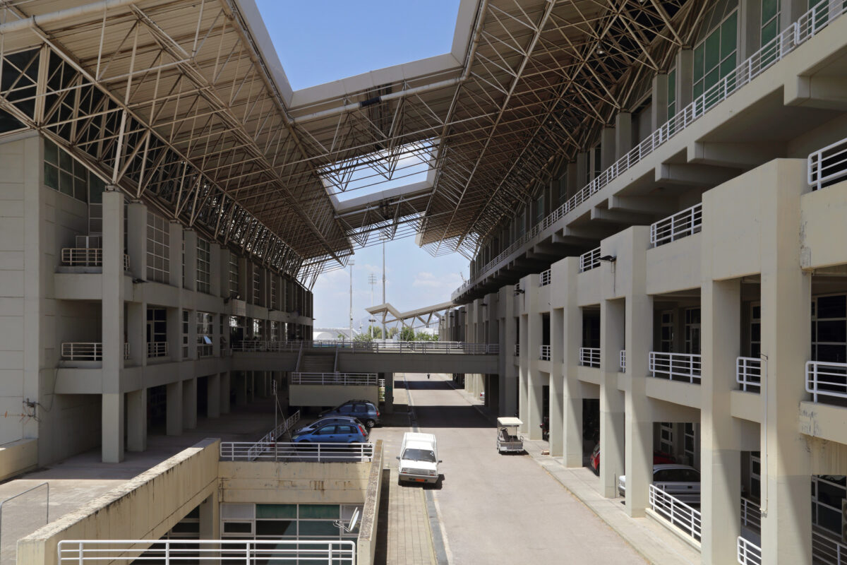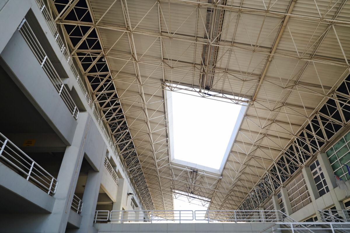 Η εντυπωσιακή Στοά Της Αγοράς στο ΟΑΚΑ, με εμφανή τα σημάδια της σκουριάς στον σκελετό. Μαρούσι, Ιούνιος 2022.