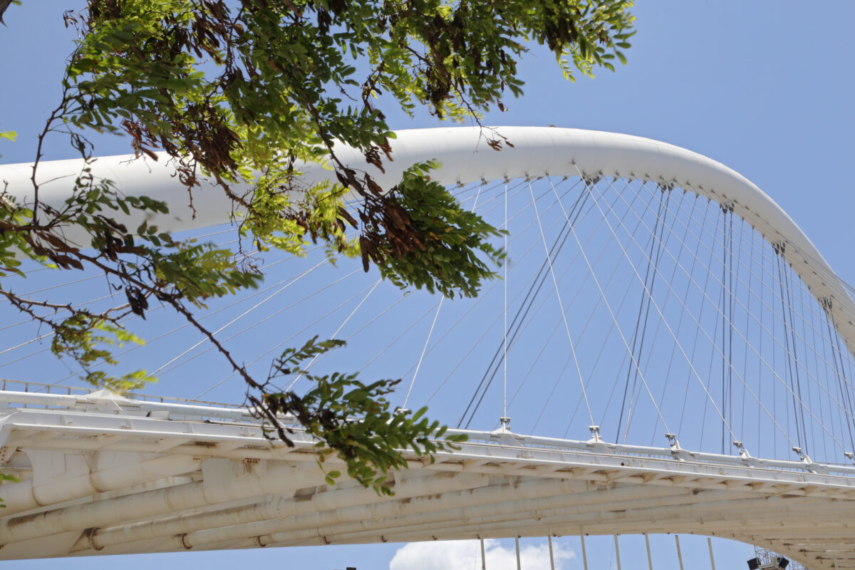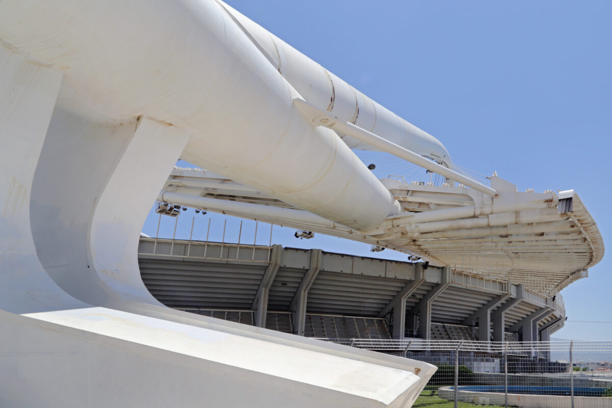 Λεπτομέρεια από το στέγαστρο Καλατράβα στο Ολυμπιακό Στάδιο, ΟΑΚΑ, Μαρούσι, Ιούνιος 2022.