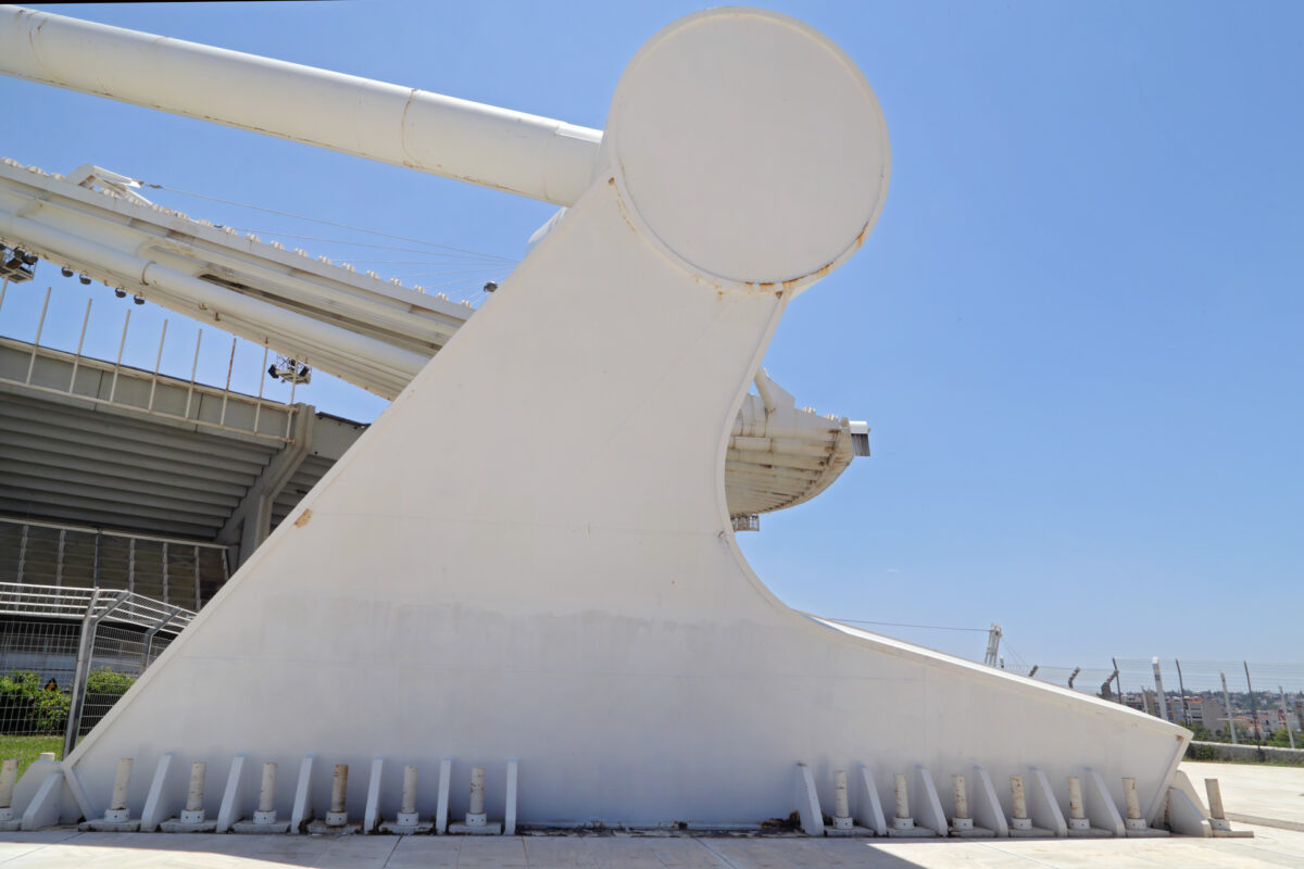 Η μία από τις δύο μεταλλικές βάσεις του στεγάστρου Καλατράβα στο Ολυμπιακό Στάδιο, ΟΑΚΑ, Μαρούσι, Ιούνιος 2022.