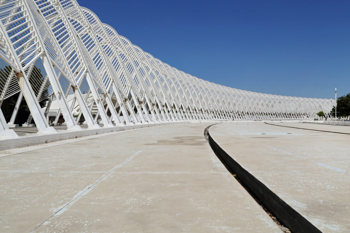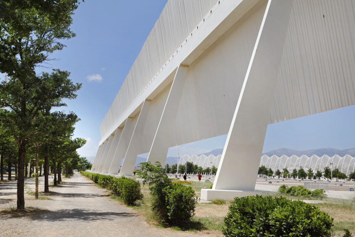 Το στέγαστρο Καλατράβα στο Ολυμπιακό Στάδιο απ' έξω, ΟΑΚΑ, Μαρούσι, Ιούνιος 2022.