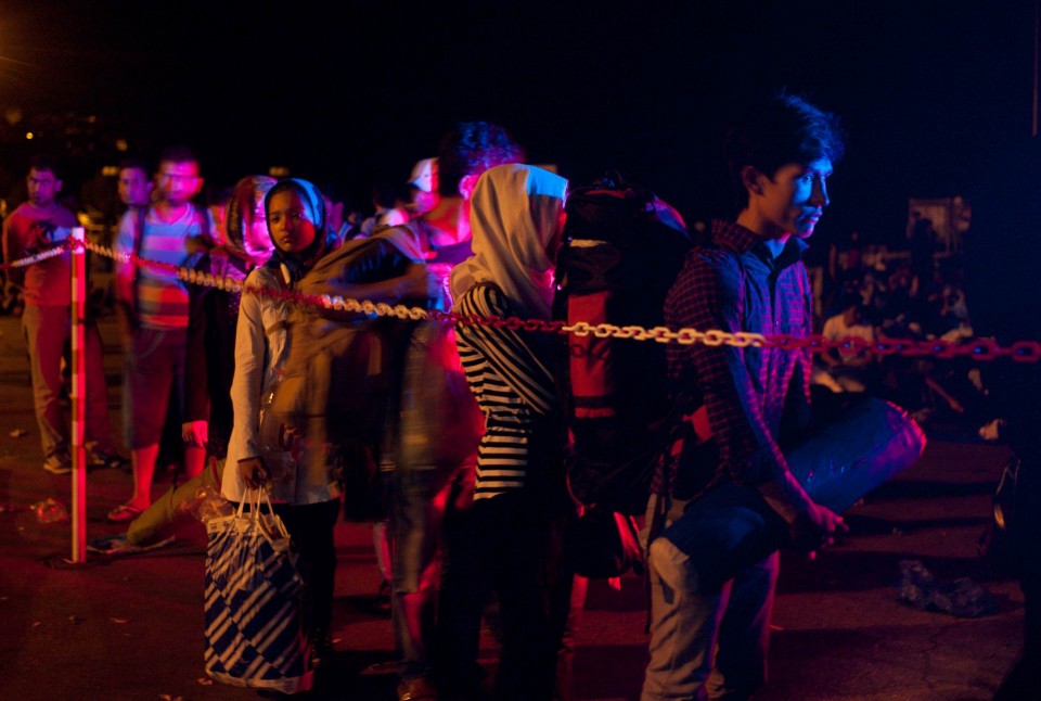 Πρόσφυγες σκεπάζονται με κουβέρτες, λόγω των κακών καιρικών συνθηκών και του κρύου, που επικρατεί αργά τη νύχτα στα σύνορα της Κροατίας με την Σερβία. Η Κροατική συνοριοφυλακή οδηγεί τους ταλαιπωρημένους πρόσφυγες σε στρατόπεδο καταγραφής, όπου θα δηλώσουν τα στοιχεία τους και θα διανυκτερεύσουν. 1, Οκτώβριος 2015