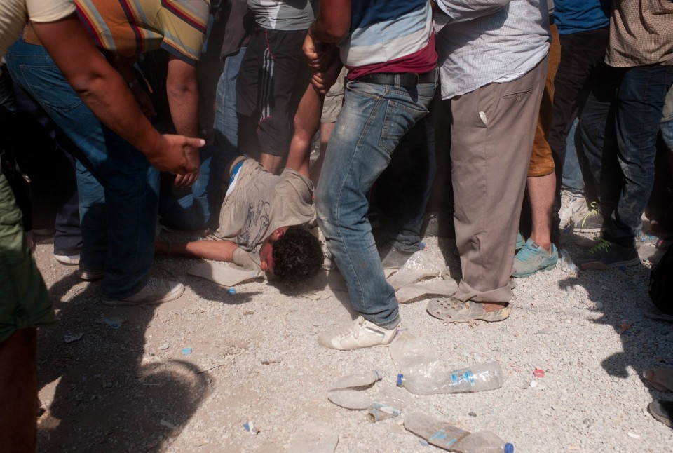 Άντρας λιποθυμάει από την ζέστη και την εξάντληση, ενώ περιμένει στην ουρά, μαζί με χιλιάδες άλλους πρόσφυγες, μπροστά από το γραφείο, στο οποίο ταυτοποιούνται και καταγράφονται τα στοιχεία τους. Δεκάδες χιλιάδες πρόσφυγες από την Συρία και από άλλες χώρες της Ασίας περιμένουν, υπό άθλιες συνθήκες, στο λιμάνι της Μυτιλήνης την ταυτοποίηση των στοιχείων τους, για να επιβιβαστούν στο πλοίο που θα τους οδηγήσει στον Πειραιά και από εκεί στην Κεντρική και Βόρεια Ευρώπη. Λέσβος, Σεπτέμβριος 2015