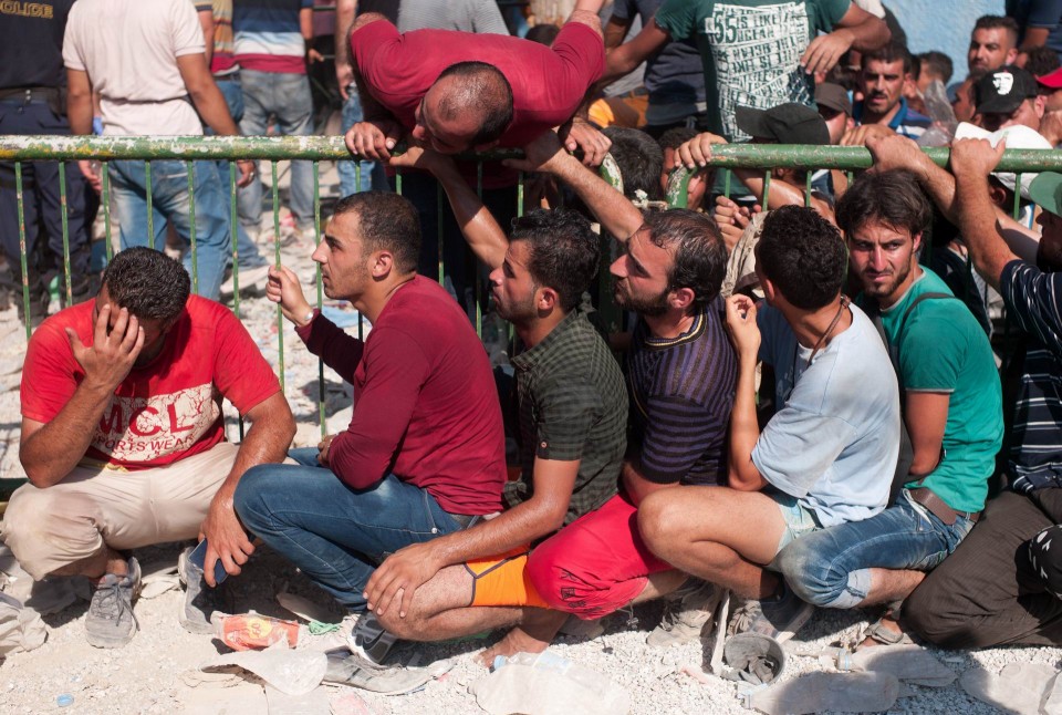 Συμπλοκές ανάμεσα σε πρόσφυγες, που περιμένουν κατά χιλιάδες την σειρά τους, μπροστά στο γραφείο καταγραφής στοιχείων. Δεκάδες χιλιάδες πρόσφυγες από την Συρία και από άλλες χώρες της Ασίας περιμένουν, υπό άθλιες συνθήκες, στο λιμάνι της Μυτιλήνης την ταυτοποίηση των στοιχείων τους, για να επιβιβαστούν στο πλοίο που θα τους οδηγήσει στον Πειραιά και από εκεί στην Κεντρική και Βόρεια Ευρώπη. Λέσβος, Σεπτέμβριος 2015