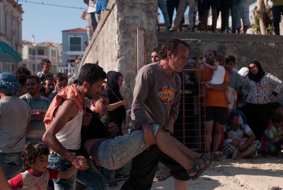 Διασώστες δίνουν τις πρώτες βοήθειες σε μικρό παιδί που ξεβράστηκε από τη θάλασσα. Πρόσφυγες απο την Συρία κι από άλλες χώρες της Ασίας φτάνουν στην Μυτιλήνη στη τοποθεσία Συκαμινέα, έχοντας διασχίσει το επικίνδυνο θαλάσσιο πέρασμα των Ελληνοτουρκικών συνόρων με κίνδυνο της ζωής τους. Ολοκληρώνουν έτσι την πρώτη φάση του ταξιδιού τους προς τις Βορειοευρωπαϊκές χώρες. Λέσβος, Οκτώβριος 2015