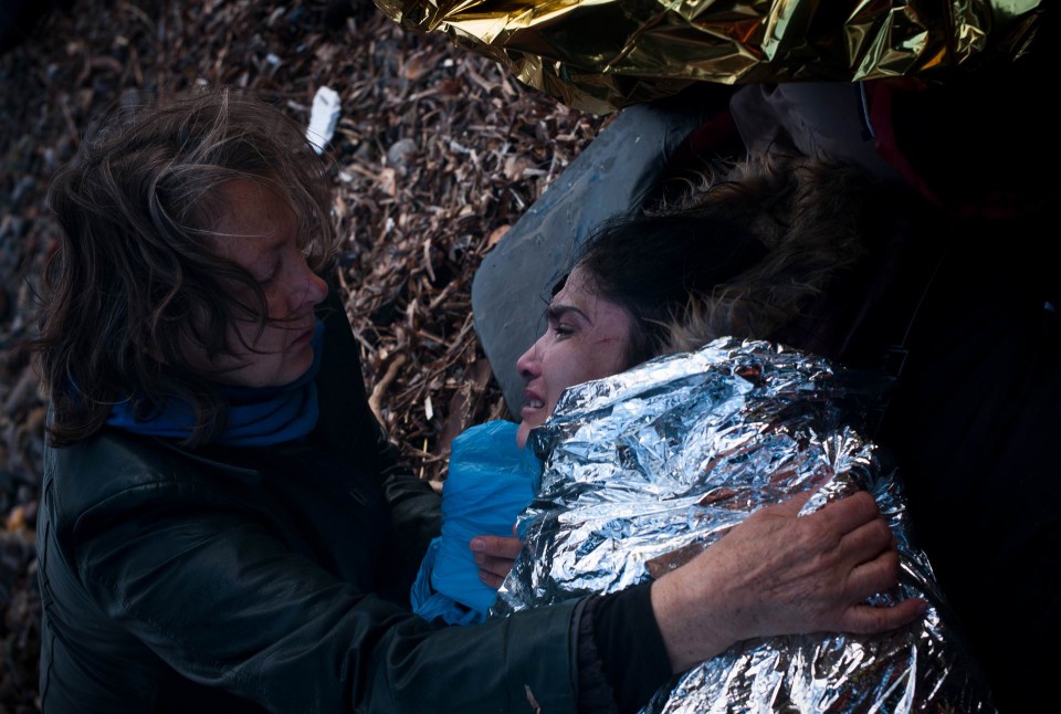 Γυναίκα πρόσφυγας, που μόλις διασώθηκε, ξεσπά σε κλάματα. Πρόσφυγες απο την Συρία και μετανάστες φτάνουν στην Μυτιλήνη στη τοποθεσία Συκαμινέα, έχοντας διασχίσει το επικίνδυνο θαλάσσιο πέρασμα των Ελληνοτουρκικών συνόρων με κίνδυνο της ζωής τους, ολοκληρώνοντας την πρώτη φάση του ταξιδιού τους προς της Βoρειοευρωπαϊκές χώρες, Οκτώβριος 2015