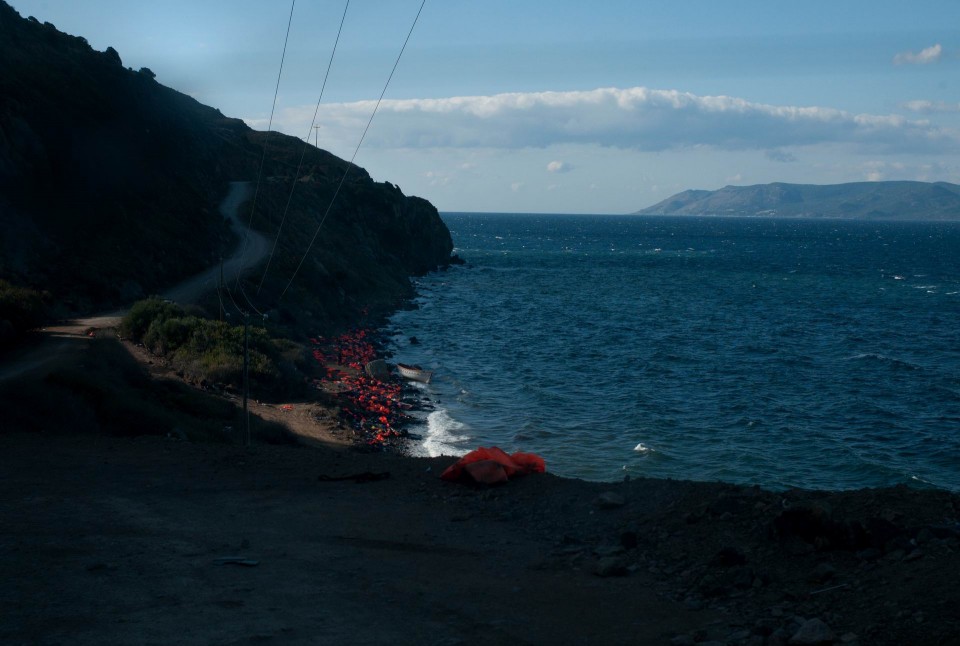 Σωσίβια πεταμένα στην ακτή. Πρόσφυγες απο την Συρία κι από άλλες χώρες της Ασίας φτάνουν στην Μυτιλήνη στη τοποθεσία Συκαμινέα, έχοντας διασχίσει το επικίνδυνο θαλάσσιο πέρασμα των Ελληνοτουρκικών συνόρων με κίνδυνο της ζωής τους. Ολοκληρώνουν έτσι την πρώτη φάση του ταξιδιού τους προς τις Βορειοευρωπαϊκές χώρες. Λέσβος, Οκτώβριος 2015