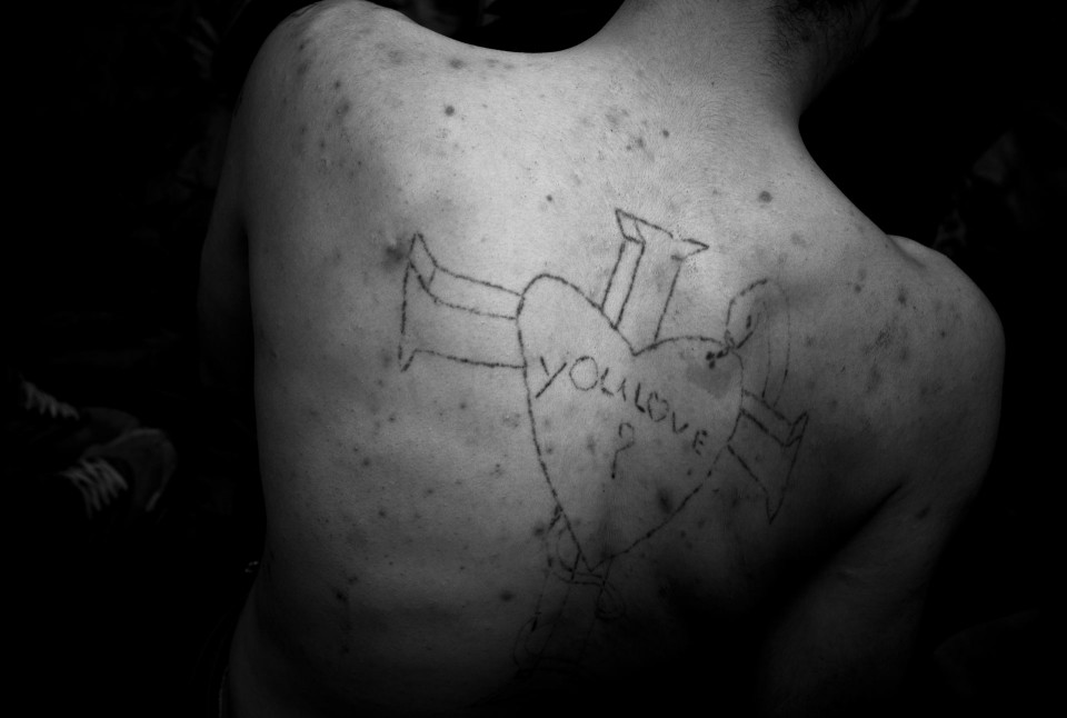 Τατουάζ στην πλάτη πρόσφυγα. Εκατοντάδες Μαροκινοί, Αλγερινοί και Πακιστανοί βρέθηκαν εγκλωβισμένοι στην Ειδομένη, στην προσπάθεια τους να διασχίσουν τα σύνορα μεταξύ Ελλάδας και πΓΔτΜ. Νοέμβριος, 2015