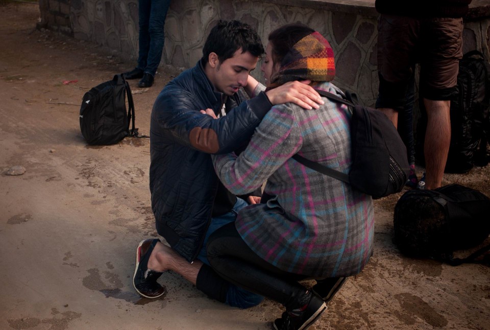 Ζευγάρι που κατάφερε να φτάσει στην ελληνική ακτή. Πρόσφυγες απο την Συρία κι από άλλες χώρες της Ασίας φτάνουν στην Μυτιλήνη στη τοποθεσία Συκαμινέα, έχοντας διασχίσει το επικίνδυνο θαλάσσιο πέρασμα των Ελληνοτουρκικών συνόρων με κίνδυνο της ζωής τους. Ολοκληρώνουν έτσι την πρώτη φάση του ταξιδιού τους προς τις Βορειοευρωπαϊκές χώρες. Λέσβος, Οκτώβριος 2015