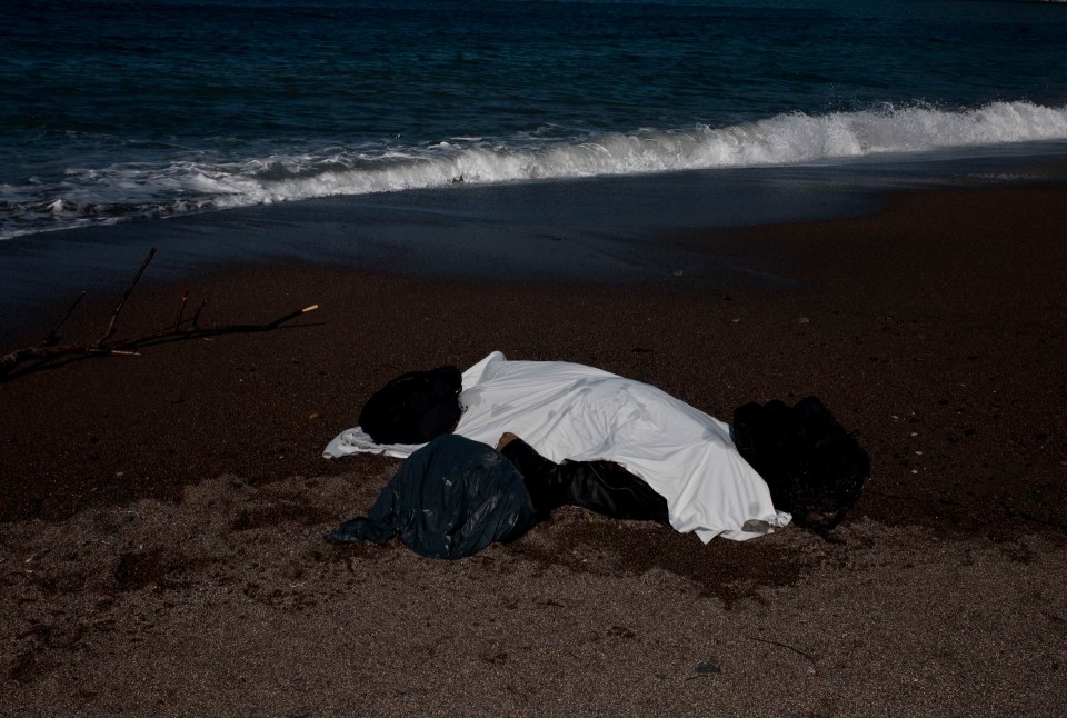 Πνιγμένος άνθρωπος έχει σκεπαστεί με άσπρο σεντόνι. Πρόσφυγες απο την Συρία κι από άλλες χώρες της Ασίας φτάνουν στην Μυτιλήνη στη τοποθεσία Συκαμινέα, έχοντας διασχίσει το επικίνδυνο θαλάσσιο πέρασμα των Ελληνοτουρκικών συνόρων με κίνδυνο της ζωής τους. Ολοκληρώνουν έτσι την πρώτη φάση του ταξιδιού τους προς τις Βορειοευρωπαϊκές χώρες. Λέσβος, Οκτώβριος 2015