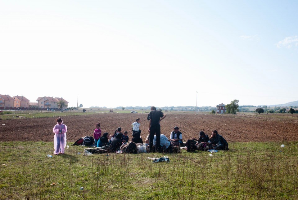 Ομάδα ανθρώπων ξεκουράζονται σε χωράφι, κοντά σε καταυλισμό καταγραφής προσφύγων στην κωμόπολη Πρέσεβο, στα σύνορα Σερβίας και πΓΔΜ. 4, Οκτώβριος 2015