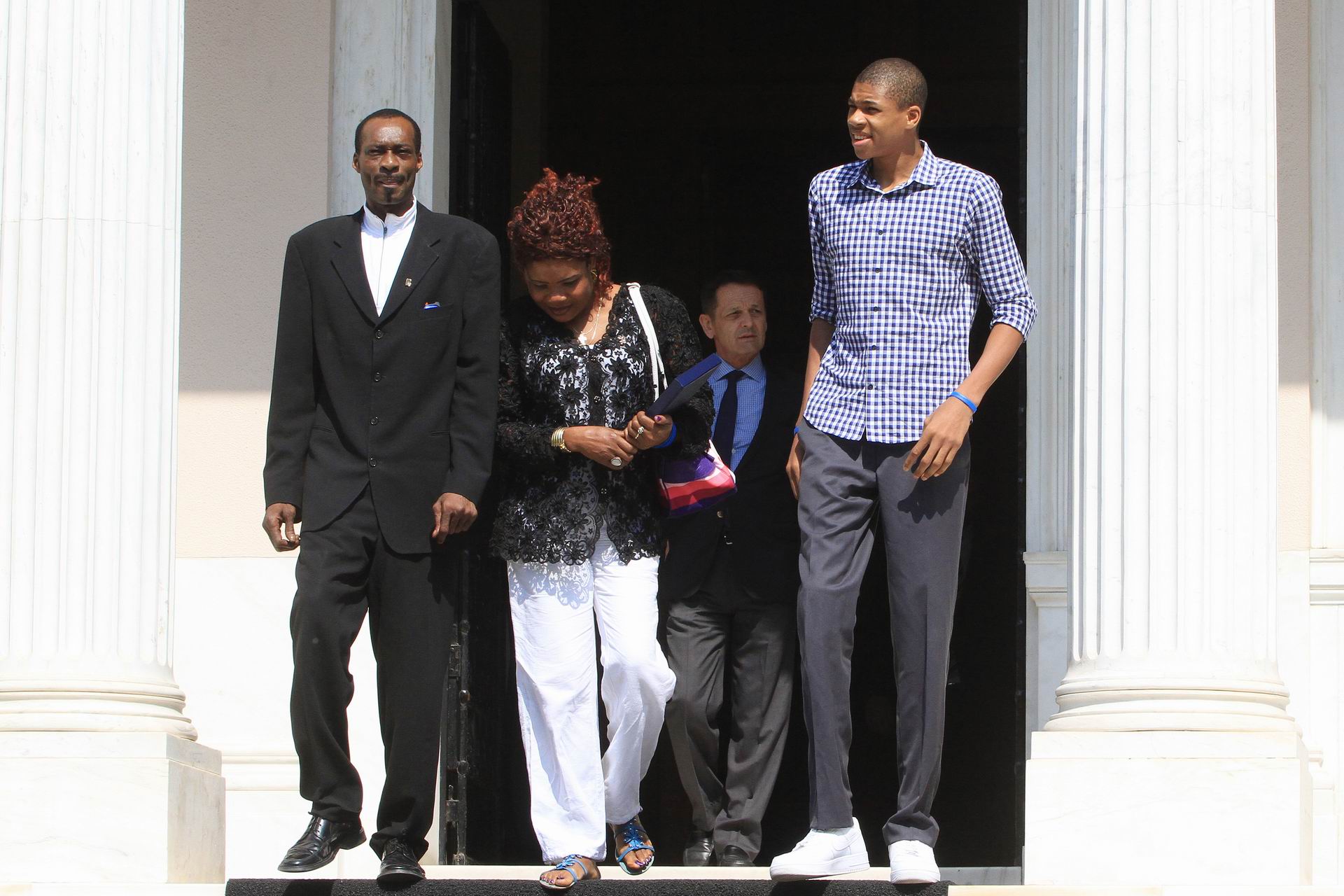 Υψηλοί προσκεκλημένοι. Αθήνα Ο Γιάννης Αντετοκούμπο και οι γονείς του εξέρχονται από το Μέγαρο Μαξίμου όπου έγιναν δεκτοί από τον Πρωθυπουργό μετά την κλήση του νεαρού μπασκετμπολίστα στο ΝΒΑ 2 Ιουλίου 2013 Φωτο: Παναγιώτης Τζάμαρος