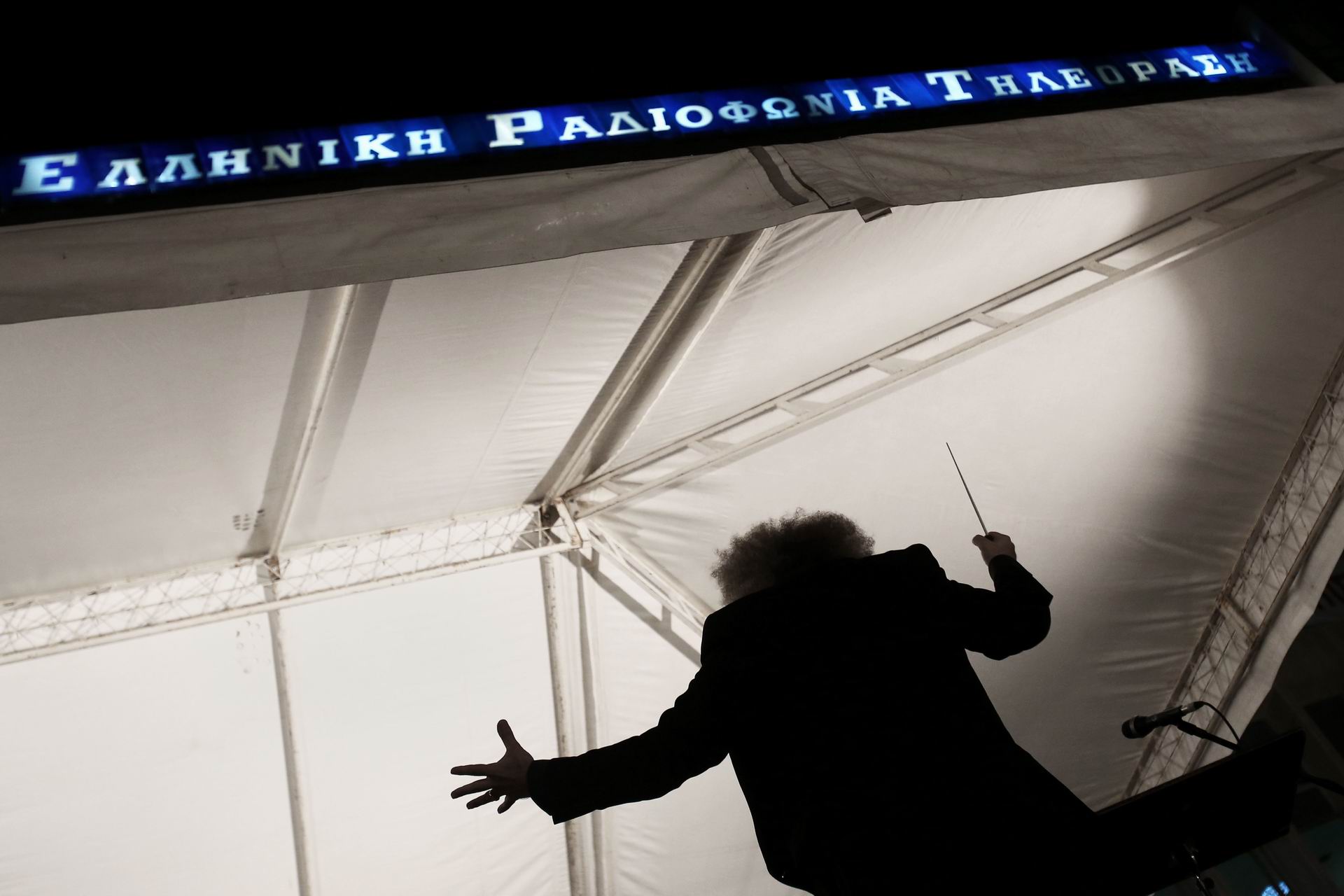 Συναυλία σε μαύρο φόντο. Αγία Παρασκευή, Αθήνα Η Συμφωνική Ορχήστρα της ΕΡΤ πραγματοποιεί συναυλία, κορυφώνοντας τις εκδηλώσεις διαμαρτυριας έξω από το Ραδιομεγαρο μετά το κλείσιμο της κρατικης ραδιοτηλεόρασης 18 Ιουνίου Φωτο: Αλέξανδρος Κατσής