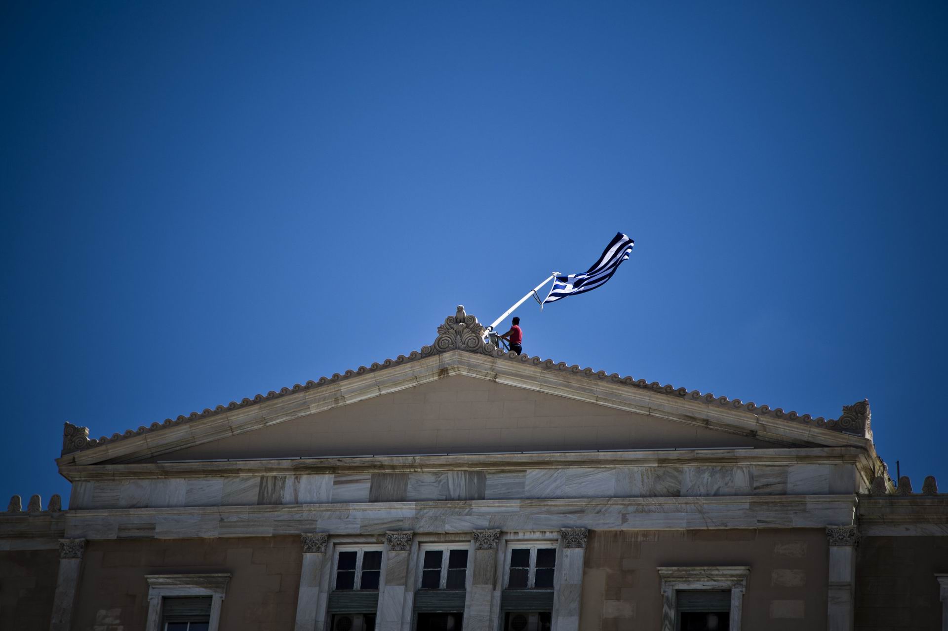 Εύθραυστο σύμβολο. Αθήνα Υποστολή της παλιάς φθαρμένης σημαίας και αντικαταστάση της με καινουργια στην κορυφή του κτιρίου της Βουλής 2 Αυγούστου 2013 Φωτο: Φίλιππος Μεσσίνης
