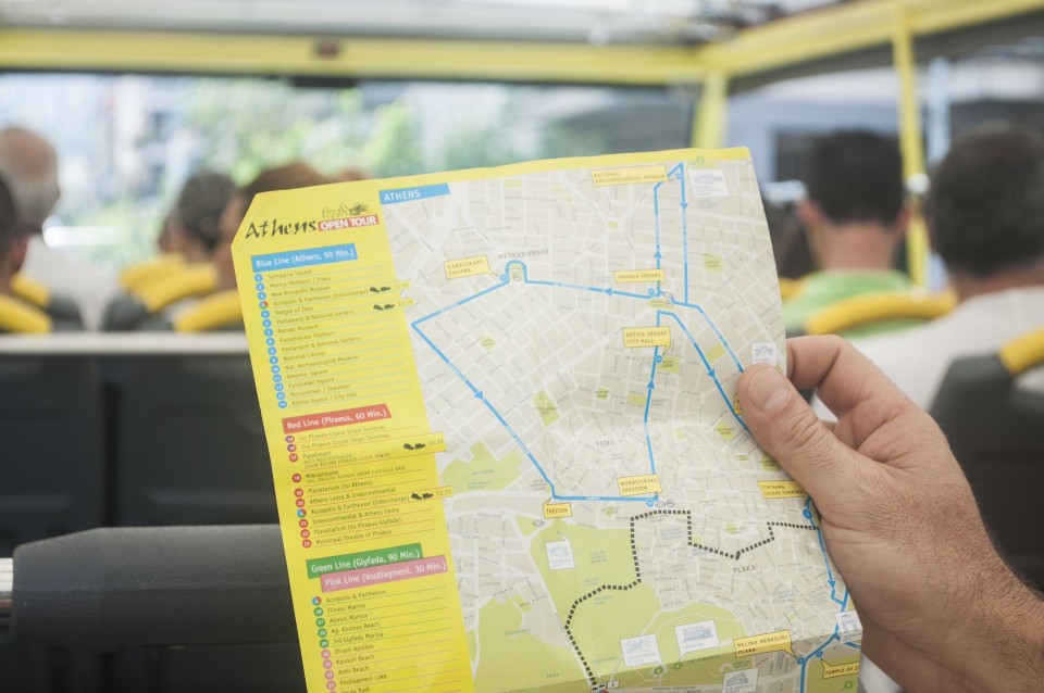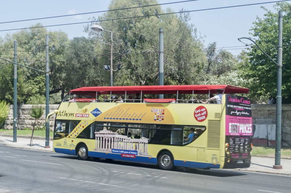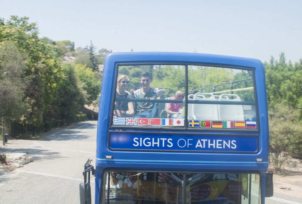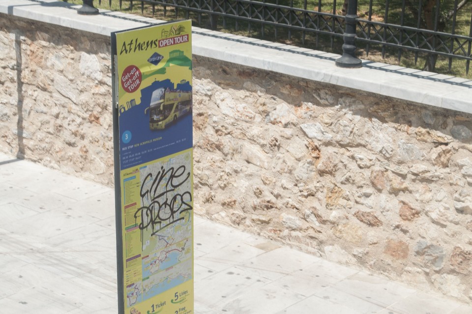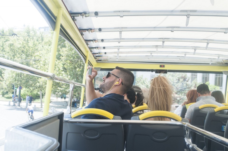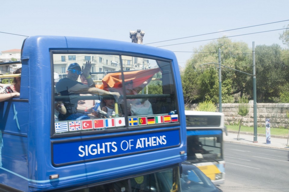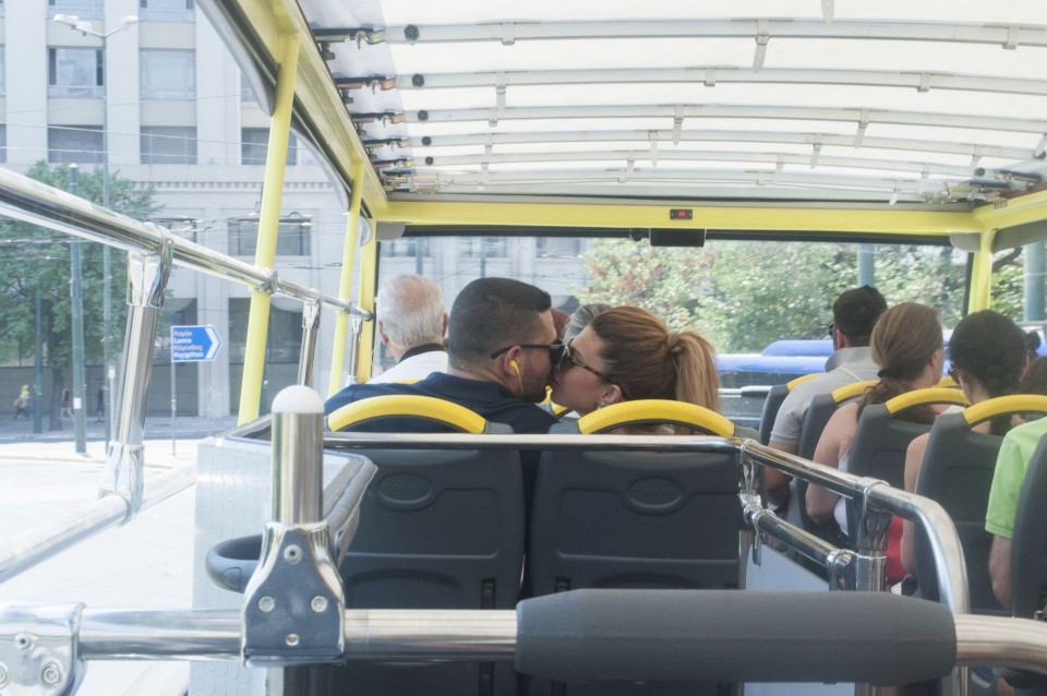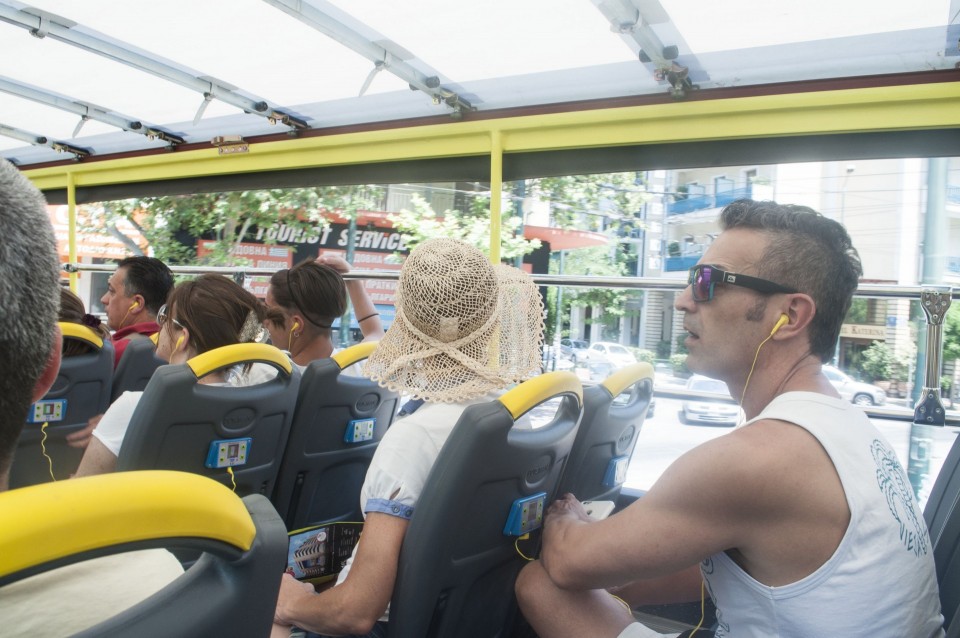 Στο σχεδόν γεμάτο λεωφορείο της Athens Open Tour οι τουρίστες τοποθετούν τα ακουστικά προκειμένου να ακούσουν την ηχογραφημένη περιήγηση. Οι περισσότεροι φορούν καπέλα, εάν και το συγκεκριμένο λεωφορείο έχει (ευτυχώς) στέγαστρο, ο οδηγός βάζει μπρος, ξεκινάμε. Οι τουρίστες για κάποιο λόγο προτιμούν να κοιτούν τους χάρτες τους και όχι ιδιαίτερα έξω από το λεωφορείο, δε διακρίνω κανένα ιδιαίτερο ενθουσιασμό , μάλιστα μια κοπέλα αποκοιμιέται, είναι κι αυτή η ελαφριά ρυθμική κίνηση του οχήματος που αναπόφευκτα σε αποκοιμίζει. Περνάμε από διάφορα αξιοθέατα όπως τα Προπύλαια, το Μουσείο, οι στύλοι του Ολυμπίου Διός. Αυτό που λένε ότι η Αθήνα είναι ένα χάος; Ε, ισχύει απόλυτα. Πρέπει να ξέρεις πού να κοιτάξεις. Κανείς από τους τουρίστες δεν είναι έτοιμος για να προλάβει να δει το Σπίτι με τις Καρυάτιδες στην Ασωμάτων ή το γκράφιτι με χέρια που προσεύχονται προς τη γη, στο πάρκινγκ κοντά στην Ομόνοια. Αλλά πέρα από τα κτίσματα είναι και οι άνθρωποι, που περπατούν στην πόλη χωρίς να σκέφτονται ότι κάποιος τους παρατηρεί από κάπου λίγο πιο ψηλά. Μια διαπίστωση: οι Αθηναίοι περπατούν κουρασμένοι. Ας το ρίξουμε στην ανυπόφορη καλοκαιρινή ζέστη.