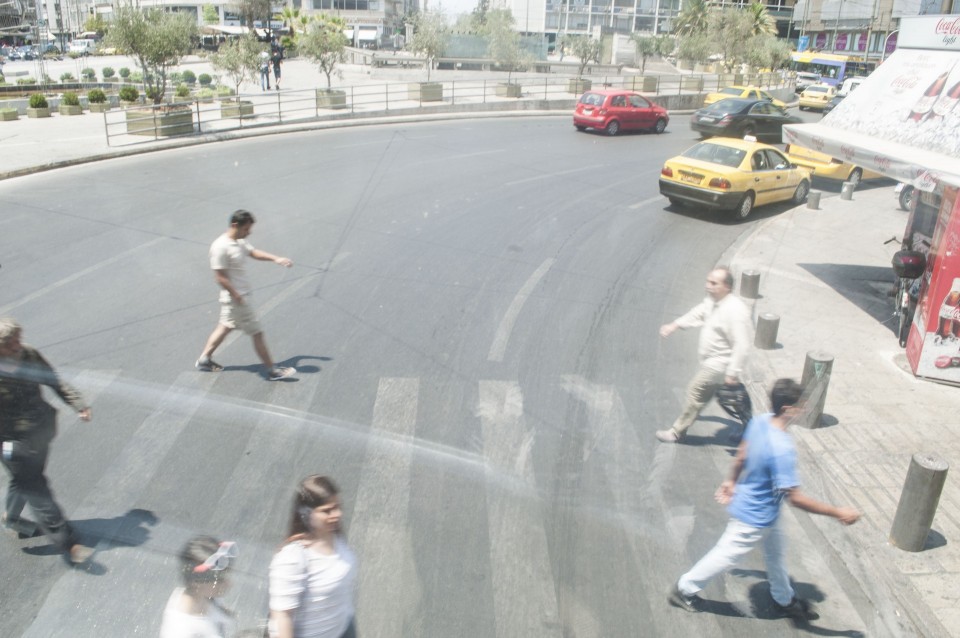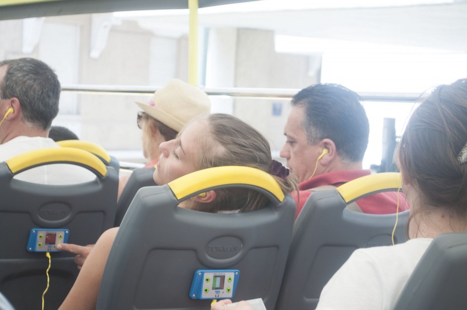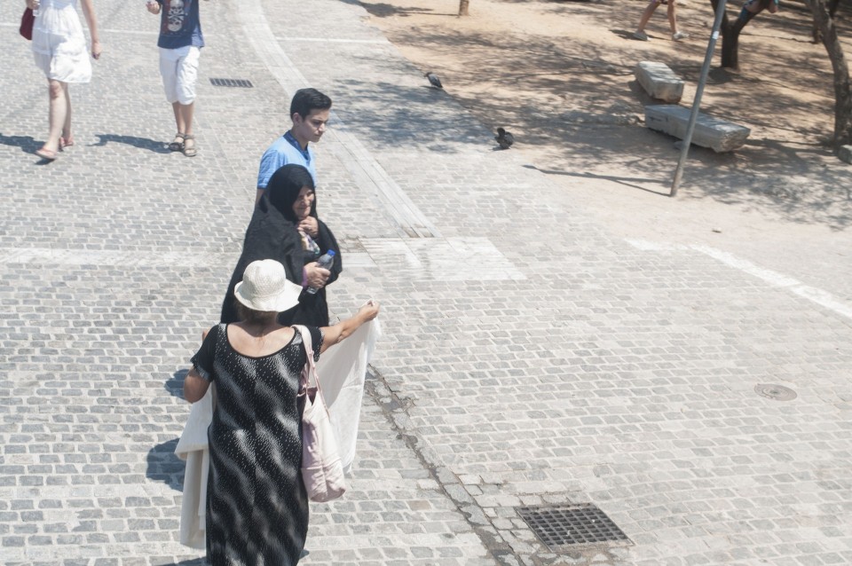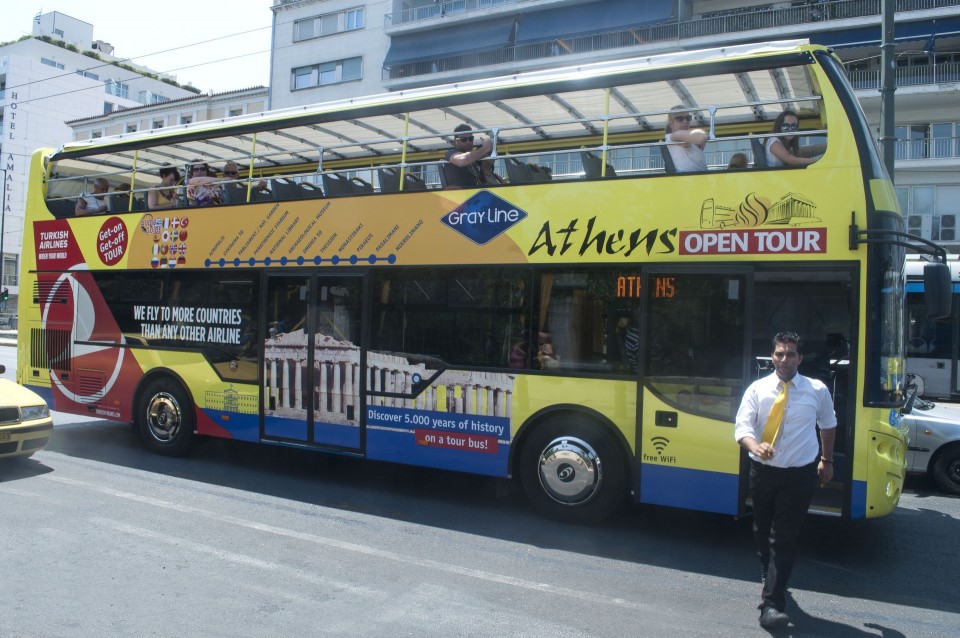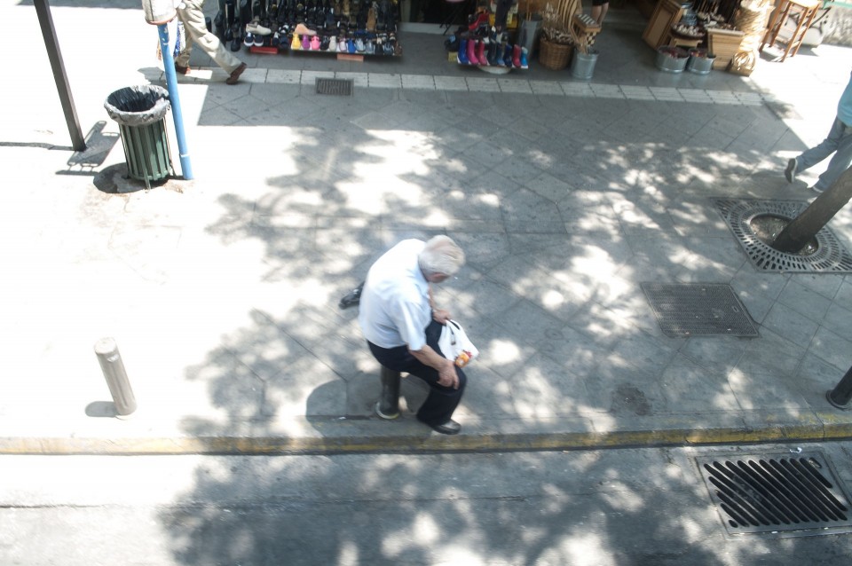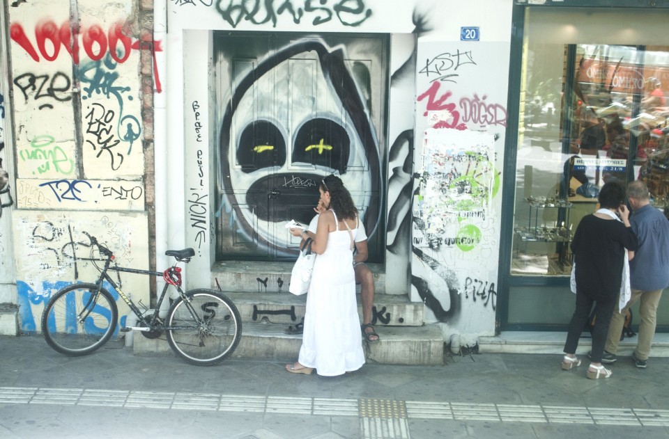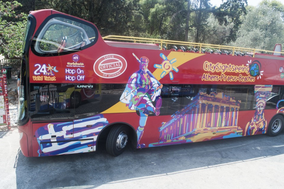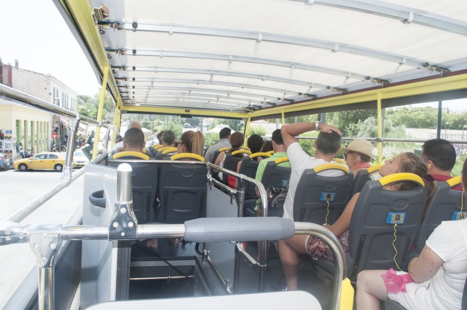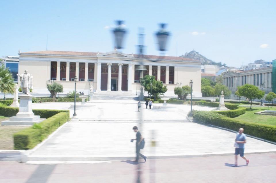 Στο σχεδόν γεμάτο λεωφορείο της Athens Open Tour οι τουρίστες τοποθετούν τα ακουστικά προκειμένου να ακούσουν την ηχογραφημένη περιήγηση. Οι περισσότεροι φορούν καπέλα, εάν και το συγκεκριμένο λεωφορείο έχει (ευτυχώς) στέγαστρο, ο οδηγός βάζει μπρος, ξεκινάμε. Οι τουρίστες για κάποιο λόγο προτιμούν να κοιτούν τους χάρτες τους και όχι ιδιαίτερα έξω από το λεωφορείο, δε διακρίνω κανένα ιδιαίτερο ενθουσιασμό , μάλιστα μια κοπέλα αποκοιμιέται, είναι κι αυτή η ελαφριά ρυθμική κίνηση του οχήματος που αναπόφευκτα σε αποκοιμίζει. Περνάμε από διάφορα αξιοθέατα όπως τα Προπύλαια, το Μουσείο, οι στύλοι του Ολυμπίου Διός. Αυτό που λένε ότι η Αθήνα είναι ένα χάος; Ε, ισχύει απόλυτα. Πρέπει να ξέρεις πού να κοιτάξεις. Κανείς από τους τουρίστες δεν είναι έτοιμος για να προλάβει να δει το Σπίτι με τις Καρυάτιδες στην Ασωμάτων ή το γκράφιτι με χέρια που προσεύχονται προς τη γη, στο πάρκινγκ κοντά στην Ομόνοια. Αλλά πέρα από τα κτίσματα είναι και οι άνθρωποι, που περπατούν στην πόλη χωρίς να σκέφτονται ότι κάποιος τους παρατηρεί από κάπου λίγο πιο ψηλά. Μια διαπίστωση: οι Αθηναίοι περπατούν κουρασμένοι. Ας το ρίξουμε στην ανυπόφορη καλοκαιρινή ζέστη.
