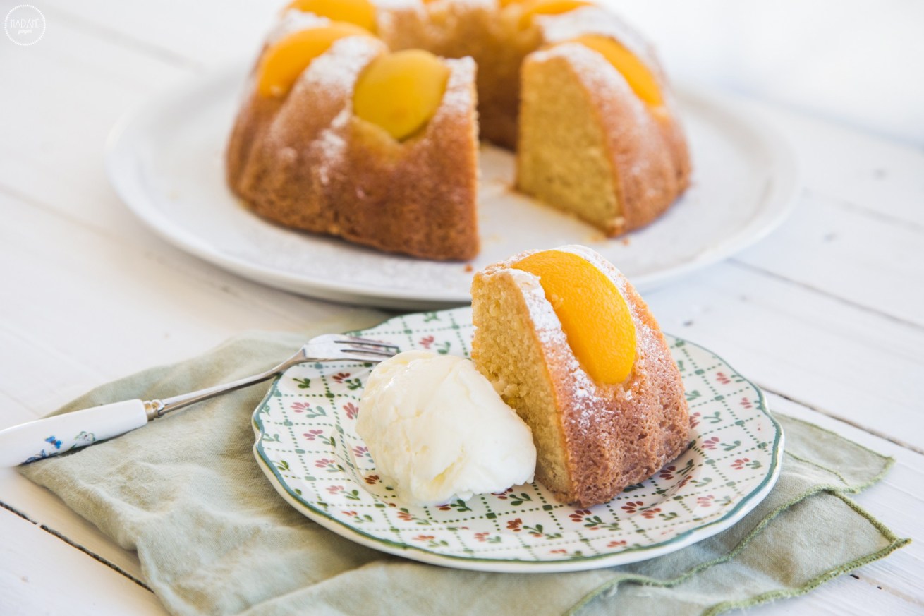 Αφράτο κέικ βανίλια με φρέσκα ροδάκινα