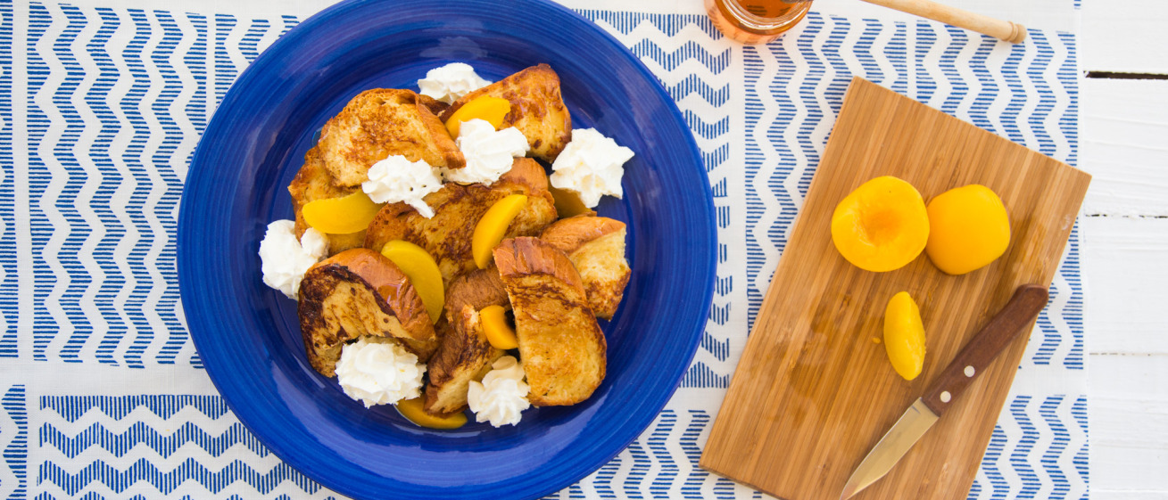 Τότε τα λέγαμε αυγόφετες, τώρα πια french toast. Η Κατίνα βουτούσε το ψωμί σε αυγό και ζάχαρη και το έψηνε σε φρέσκο βούτυρο που έφερνε σε τούβλα ολόκληρα από τη Νάξο οταν πια γυρνούσαμε από τις διακοπές. Εγώ πια, βουτάω σε γάλα και αυγό χοντρές φέτες τσουρεκιού αντί για ψωμί, αλλά εξακολουθώ να τις σερβίρω με ροδάκινο κομπόστα σε μια προσπάθεια να κρατήσω την ανάμνηση της πιο αγαπημένης μου γιαγιάς ζωντανή. Συνταγή εδώ.