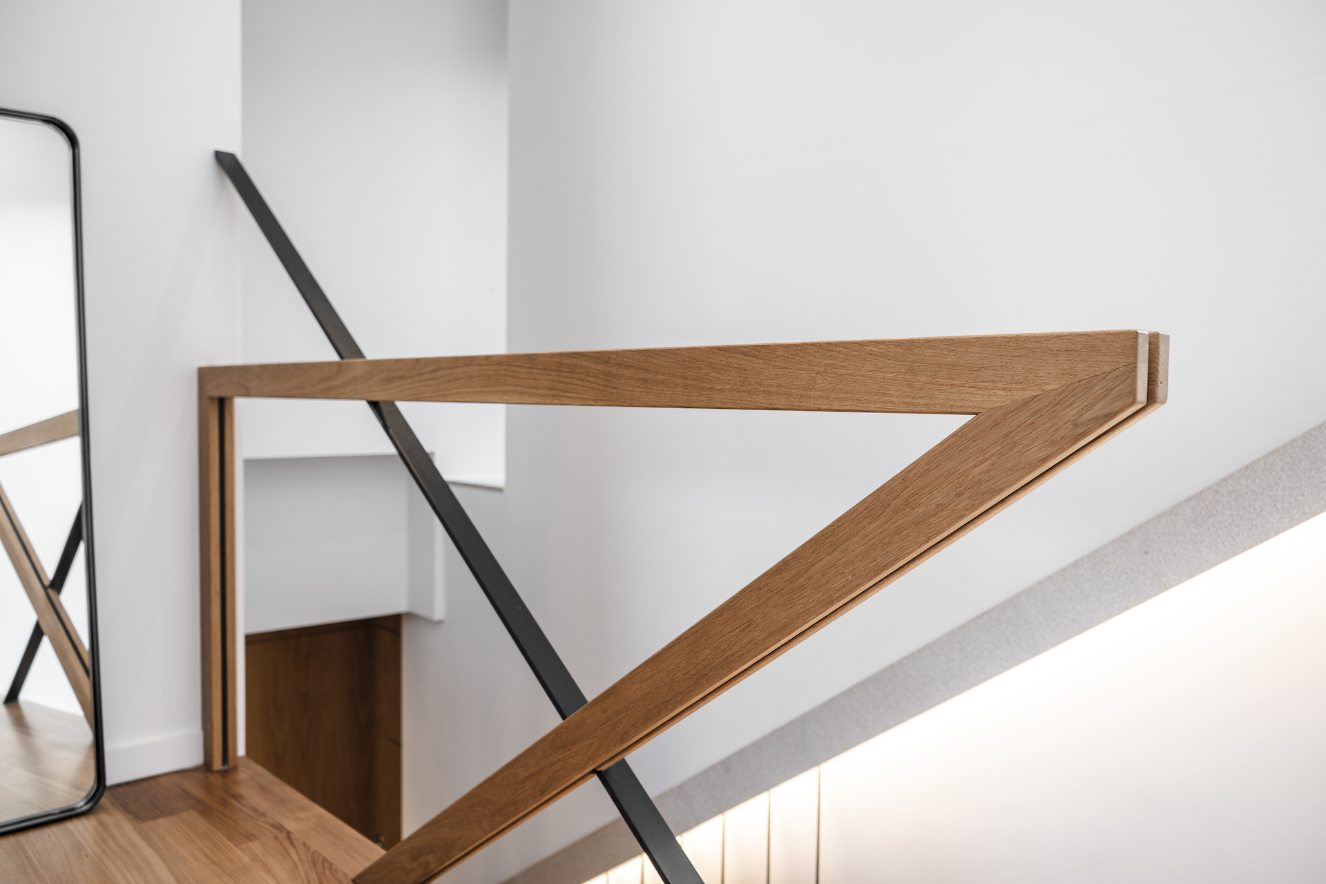 «Αυτό επιδιώκεται με τη μεταφορά του ορίου από τον υφιστάμενο φέρων οργανισμό προς το εσωτερικό της κατοικίας, την κατάρριψη της παραλληλίας, καθώς και τη χρήση ενιαίου υλικού δαπέδου σε εσωτερικό και εξωτερικό χώρο», κατά τους αρχιτέκτονες που εκτός από το ότι αναδεικνύουν με τον σχεδιασμό τους την ομορφιά του ξύλου, έχουν δημιουργήσει την εσωτερική σκάλα ως μια μεταλλική κατασκευή, με αφαιρετικά γεωμετρικά στοιχεία και μεταλλικές ράβδους, στη θέση των κιγκλιδωμάτων. Οι πρώτοι αναβαθμοί της σκάλας δημιουργούνται από όγκους, σε δύο διαφορετικούς χρωματισμούς μαρμάρου.