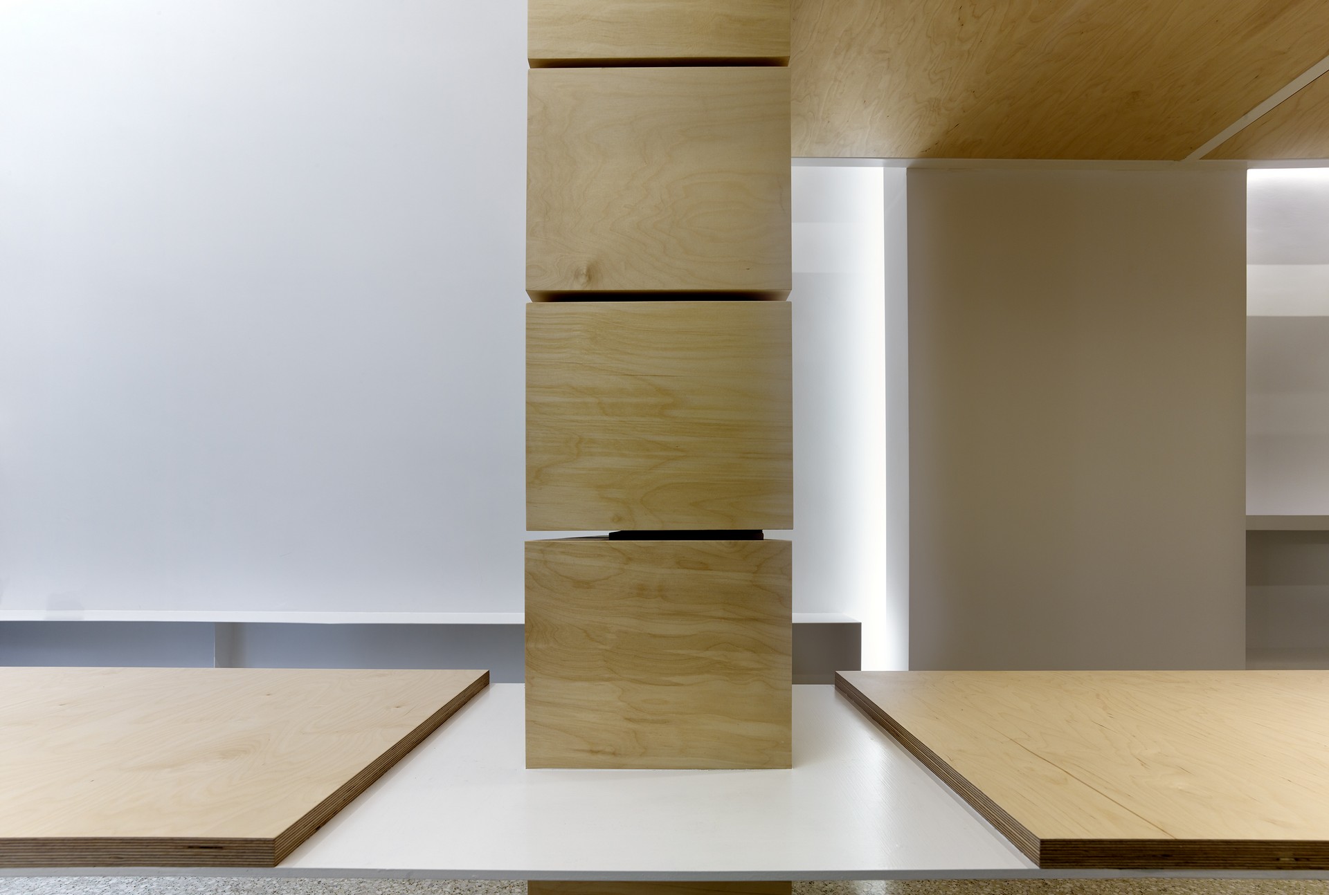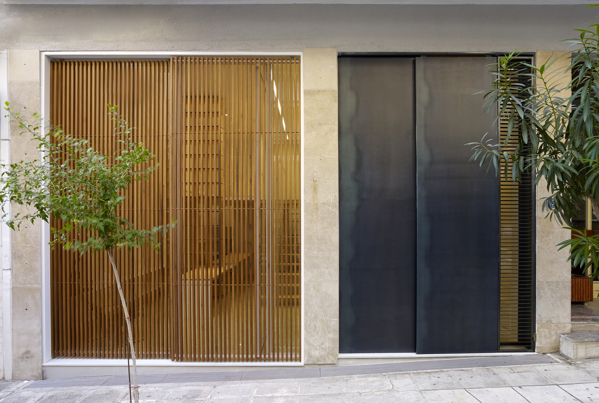 Βασικό στοιχείο της διπλής επέμβασης αποτελεί η δημιουργία δύο αυτοτελών αρθρωτών κατασκευών μικρής κλίμακας που είναι ανεξάρτητες από το υφιστάμενο δομικό σύστημα του παλιού κτιρίου, τόσο στο εσωτερικό του όσο και στην όψη των δύο χώρων προς το δρόμο. «Στόχος αυτής της συνθετικής επιλογής είναι ο επαναπροσδιορισμός της κατοίκησης ενός ισόγειου χώρου σε πυκνό αστικό περιβάλλον, με την ανάδειξη αυτής της διαλεκτικής σχέσης μεταξύ επέμβασης και υφιστάμενου», εξηγεί ο αρχιτέκτονας.