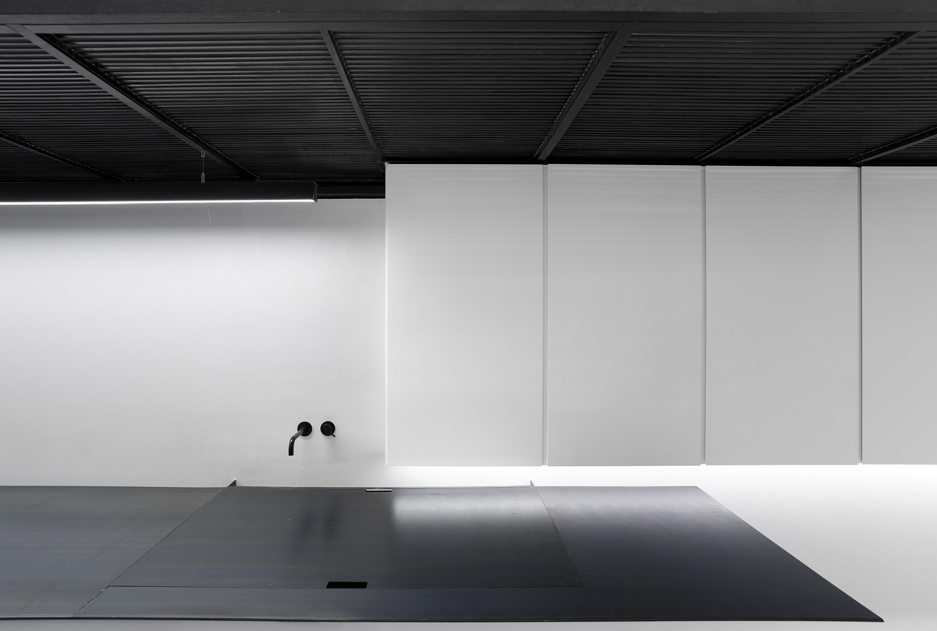 Ο δεύτερος χώρος, το εργαστήριο του καλλιτέχνη είναι μία ελαφριά μεταλλική κατασκευή εμφανούς χάλυβα που, ξεκινώντας από την όψη, αναπτύσσεται σε όλο το βάθος του χώρου τονίζοντας την προϋπάρχουσα γραμμική δομή του. Αυτό αποτελεί και το συνθετικό εργαλείο οργάνωσης των λειτουργιών ενώ τα στοιχεία που το αποτελούν, όπως ο πάγκος, ο εξώστης και η σκάλα δημιουργούν και τις συνθήκες οικειοποίησής του. «Οι δύο επεμβάσεις εντάσσονται στην υφιστάμενη κατάσταση, εκφράζοντας τους κανόνες της κατασκευαστικής τους δομής».