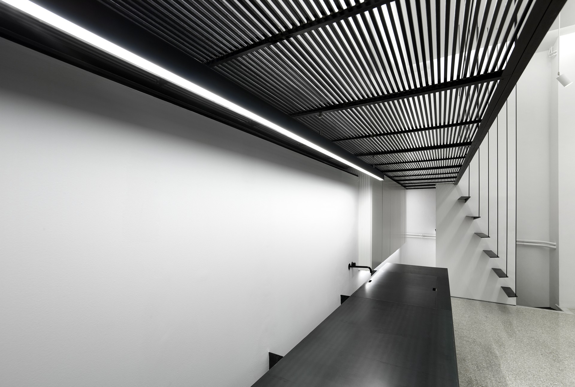 Ο πρώτος χώρος, το δικηγορικό γραφείο αποτελείται από μια κατασκευή που συνδυάζοντας το μέταλλο με το ξύλο οργανώνει γραμμικά τους χώρους εργασίας και υποδοχής, ενώ παράλληλα αποκαλύπτει το μεγάλο ύψος του υφιστάμενου εσωτερικού «με την αναλυτική προσέγγιση των συνθετικών του στοιχείων. Τόσο ο χειρισμός της όψης, όσο και των πεπερασμένων στοιχείων οργάνωσης του εσωτερικού, διερευνούν την έννοια της ιδιωτικότητας με εργαλείο τη διαφάνεια και τη σχέση με το δρόμο».