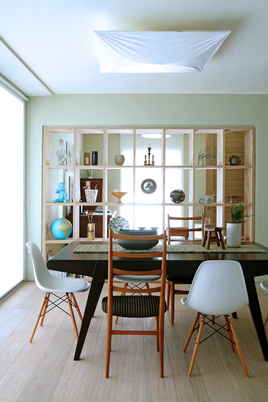 Τα έπιπλα είναι οικογενειακά κειμήλια που ανανεώθηκαν, όπως η μεταπολεμική σκανδιναβική τραπεζαρία που βάφτηκε με σκούρο βερνίκι κεριού κι οι δύο καρέκλες από καρυδιά με την ψηλή πλάτη. Ανάμεσά τους στέκονται έπιπλα νέων σχεδιαστών όπως των Eames, όπως οι καρέκλες DSW των Charles & Ray Eames. Το τραπεζάκι που φωτίζεται από το χάλκινο φωτιστικό του σχεδιαστή Tom Dixon, αποτελεί τμήμα της διπλωματικής του Αλέξανδρου Μαγκανιώτη στο Λονδίνο. Στην επιφάνεια του έχει εφαρμοστεί η κάτοψη αεροδρομίου του Heathrow και με οδηγό τους άξονες των αεροδιαδρόμων έχει γίνει μια απόπειρα τεμαχισμού και συρραφής του με κλωστή.