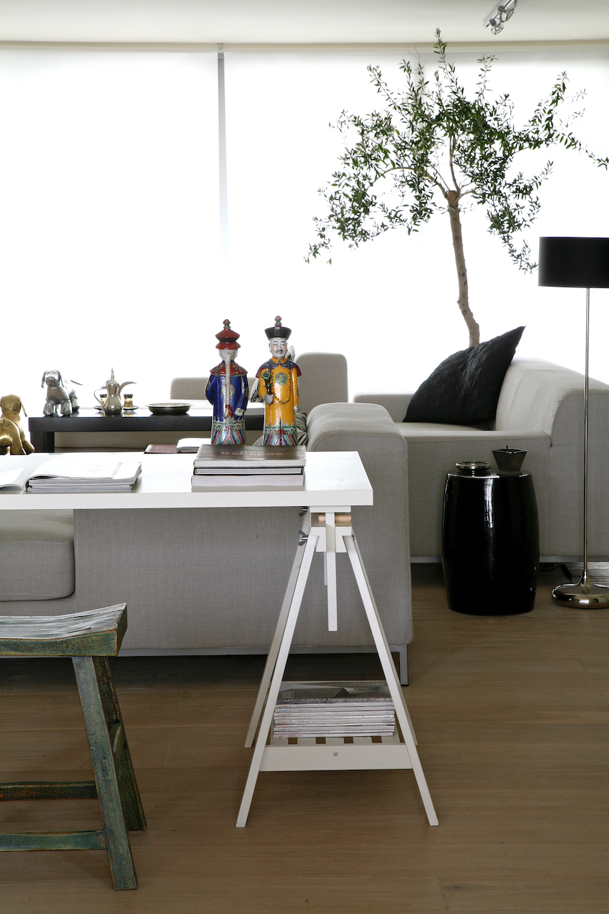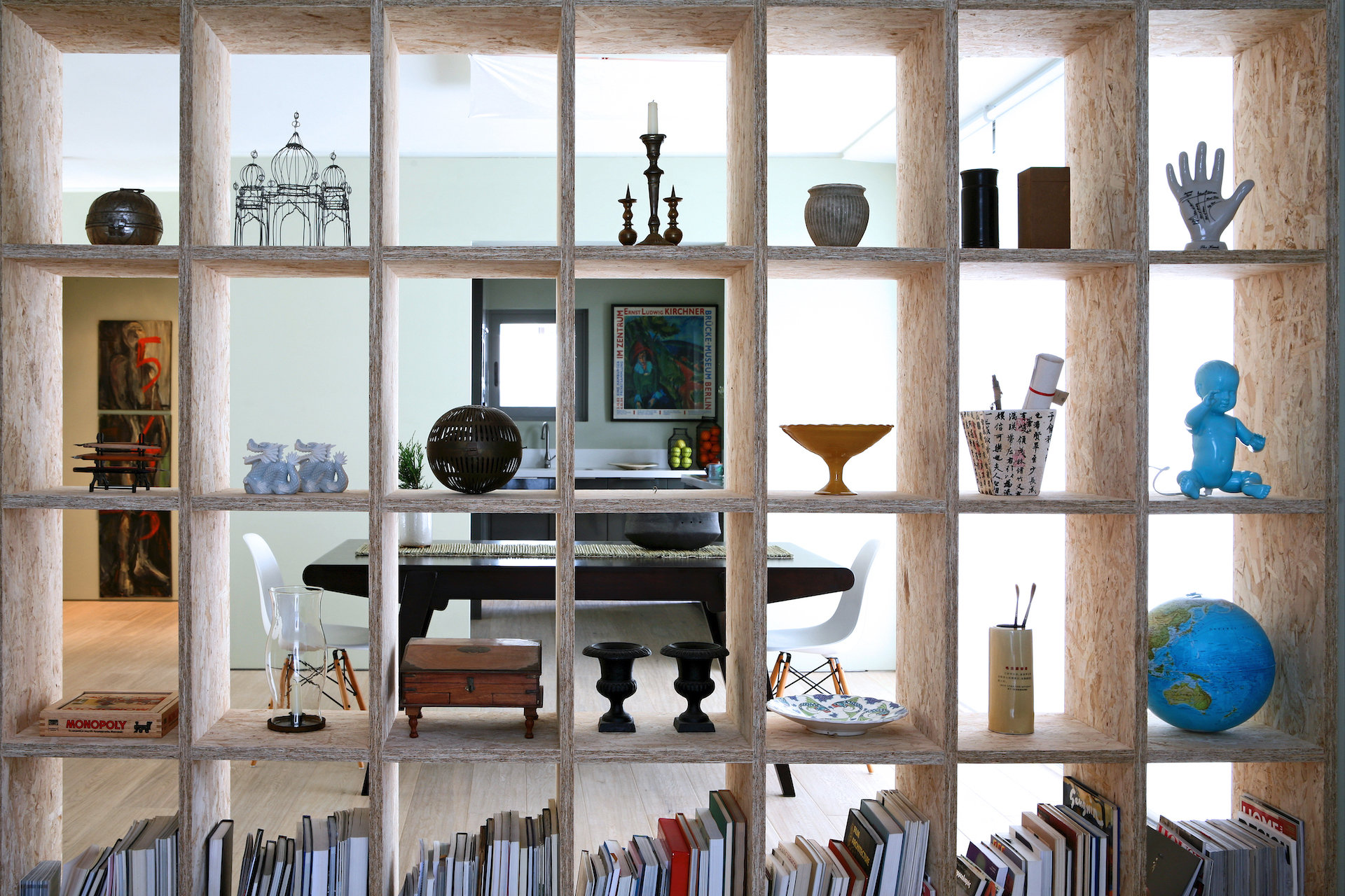 Τα υλικά που επιλέχθηκαν είναι φυσικά, όπως το δάπεδο από λευκή δρυ με ακατέργαστο τελείωμα που καλύπτει από άκρη σε άκρη το διαμέρισμα. Η βιβλιοθήκη έχει πάρει το ρόλο προθήκης που φιλοξενεί ετερόκλητα αντικείμενα όπως η υδρόγειος, μια μπλε κούκλα φωτιστικό και ένα γλυπτό χέρι με τις γραμμές χειρομαντείας.