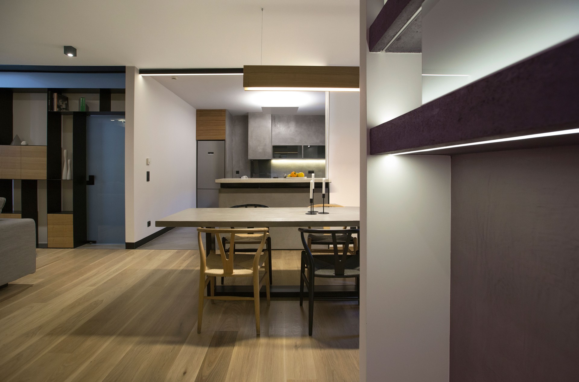 Εκτός από την κατασκευή του πάσου, πάνω στο οποίο έχει τοποθετηθεί ένας πάγκος από μωσαϊκό, αυτό επιτυγχάνεται τόσο με την αλλαγή του υλικού του δαπέδου από ξύλο σε τσιμεντοκονία, όσο και με τη δημιουργία ενός γραμμικού μεταλλικού φωτιστικού που διατρέχει σε όλο το μήκος τη μια πλευρά της οροφής της κουζίνας και λειτουργεί έτσι ως ένα είδος κορνίζας του χώρου.
