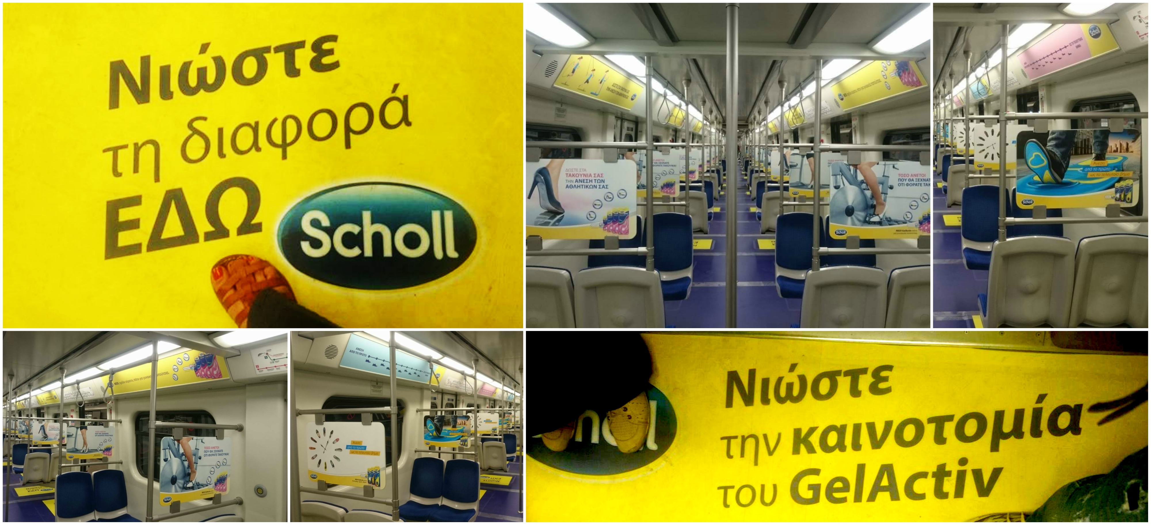 Για πρώτη φορά στην Ελλάδα, ένας συρμός του μετρό δίνει τη δυνατότητα στο επιβατικό κοινό να βιώσει το αληθινό αίσθημα των πάτων Scholl Gel Activ! Η μοναδική αίσθηση των πάτων Scholl Gel Activ ενσωματώνεται στο πάτωμα του συρμού και προσκαλεί όλους να νιώσουν την άνεση που προσφέρουν οι νέοι αναπαυτικοί πάτοι.