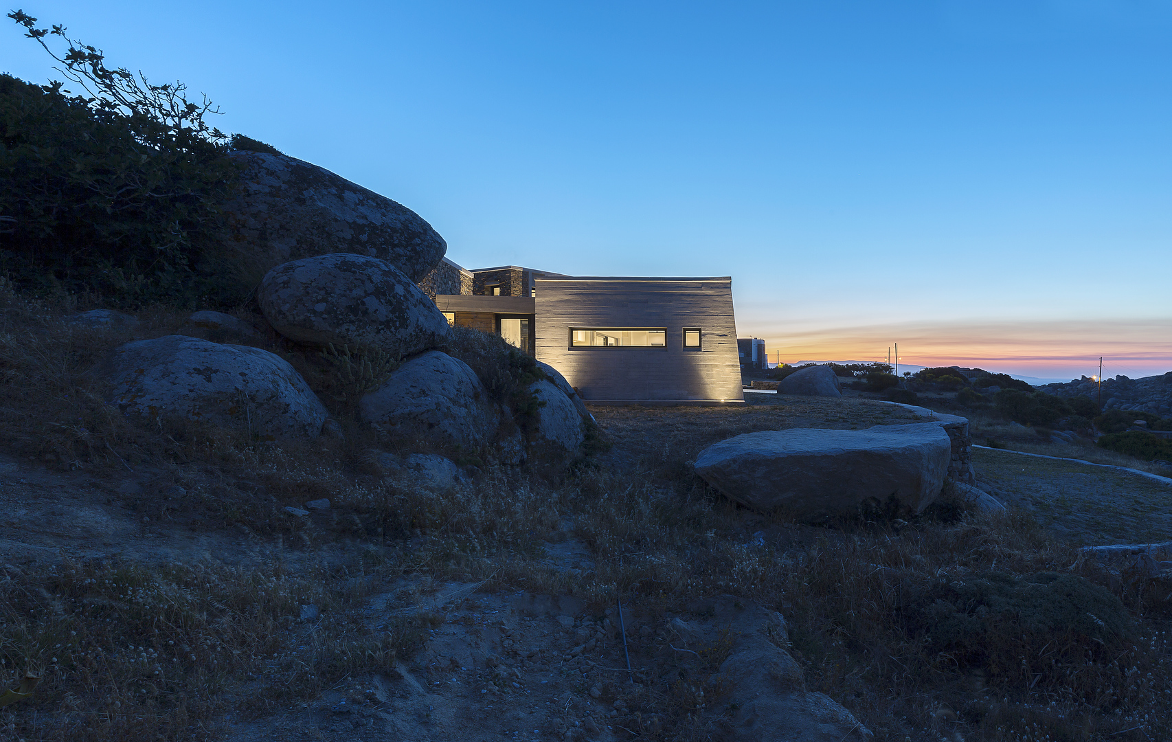 Χαρακτηριστική είναι η βορεινή όψη της κατοικίας, καθώς ένας όγκος από εμφανές και άβαφο σκυρόδεμα δημιουργεί ένα «όριο», μια τεχνητή προστασία από τον «Βοριά». «Η επιλογή αυτής της υλικότητας αποτελεί παραλληλισμό στους βράχους, ενώ σε βάθος χρόνου, όταν τα πολύχρωμα αδρανή του σκυροδέματος αναδυθούν στην επιφάνεια, θα ενσωματωθεί απόλυτα στο τοπίο».